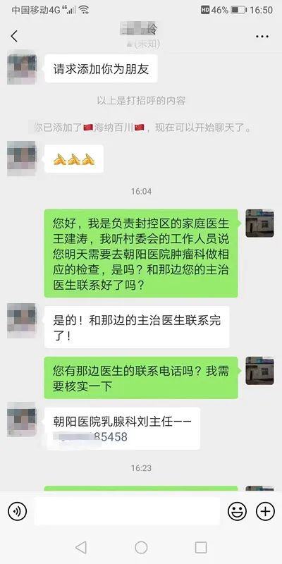5月22日,沙河镇于辛庄村封控区一居民求助,求助者王女士是一位乳腺肿瘤患者,长期在朝阳医院接受治疗,定于5月23日到朝阳医院抽血化验检查。家庭医生王建涛接到王女士电话诉求后详细记录信息,第一时间联系朝阳医院肿瘤科,找到王女士主治医生核实情况,并把封控区情况告知朝阳医院的医生让医生做好接诊准备。