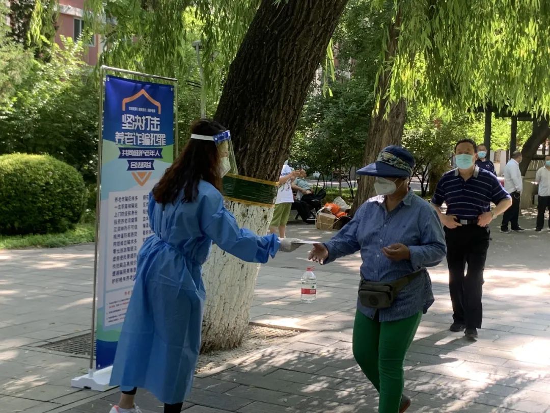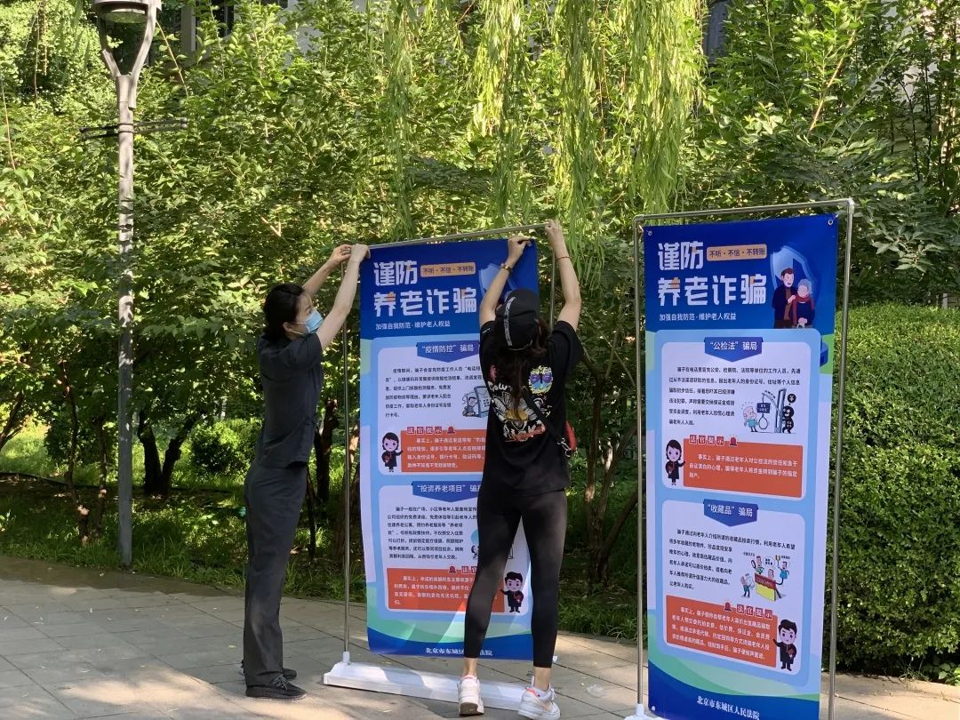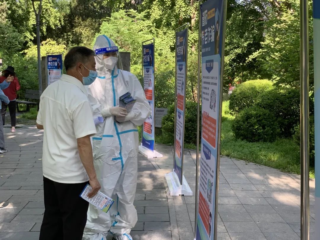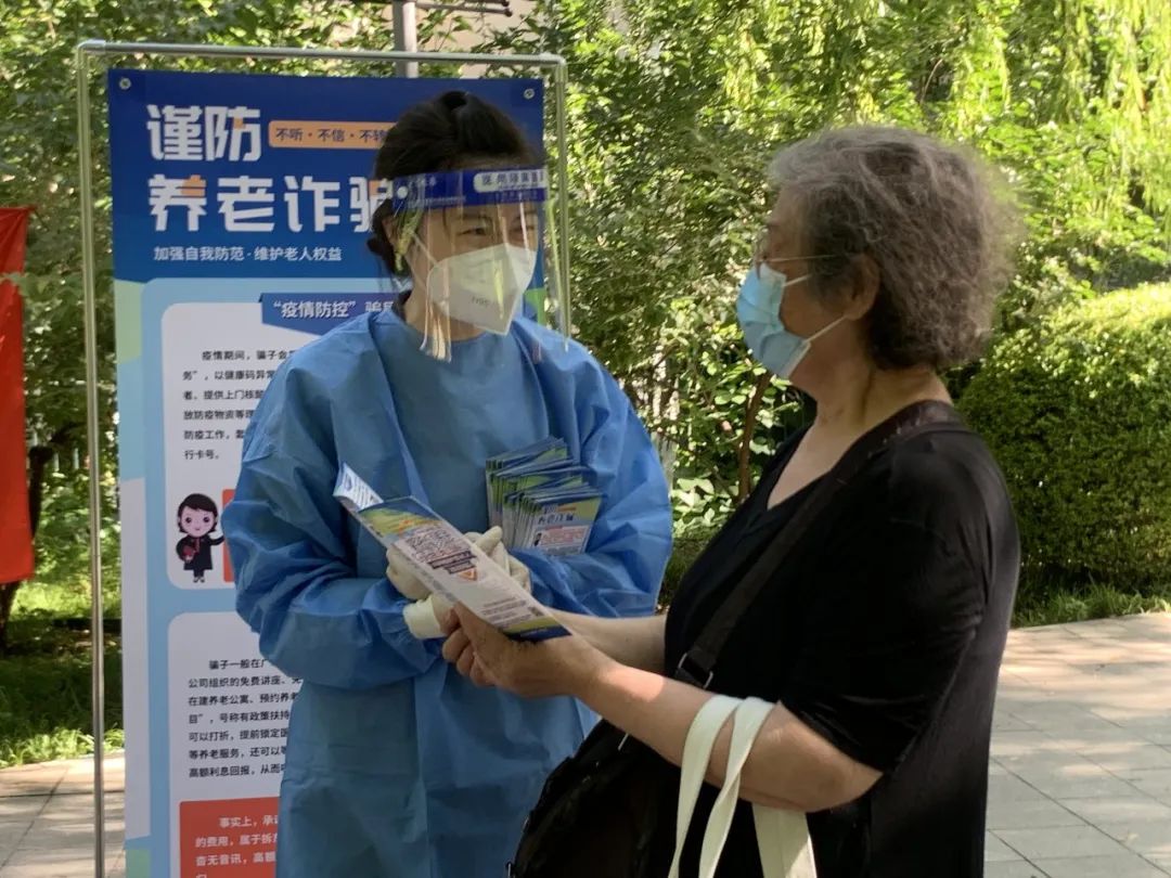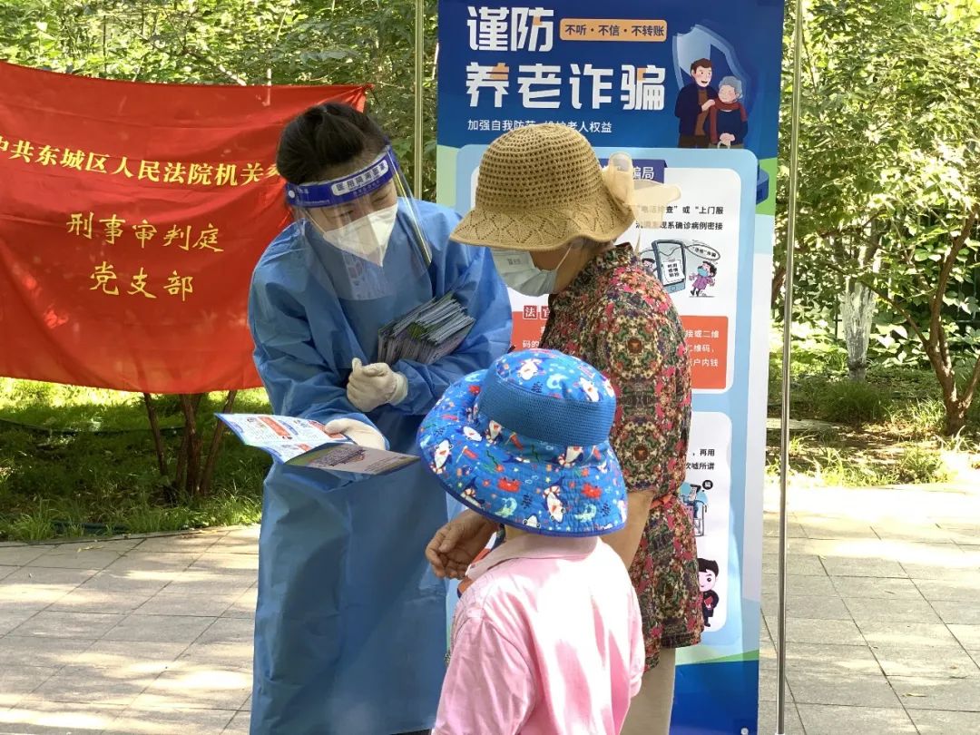 “大妈,这个预防养老诈骗的小册子您拿着,趁着排队,正好您也看一看,帮您提高反诈骗意识。”6月1日一大早,北新桥街道南馆公园常态化核酸检测点,下沉支援核酸检测的东城法院刑事审判庭副庭长罗兰和同事们一起,一边维持秩序,一边向排队做核酸的居民发放预防养老诈骗的宣传手册。除了宣传手册,在核酸检测点,与两米间隔线同位排列、依次摆放的预防养老诈骗的宣传展板也吸引了不少居民的目光。