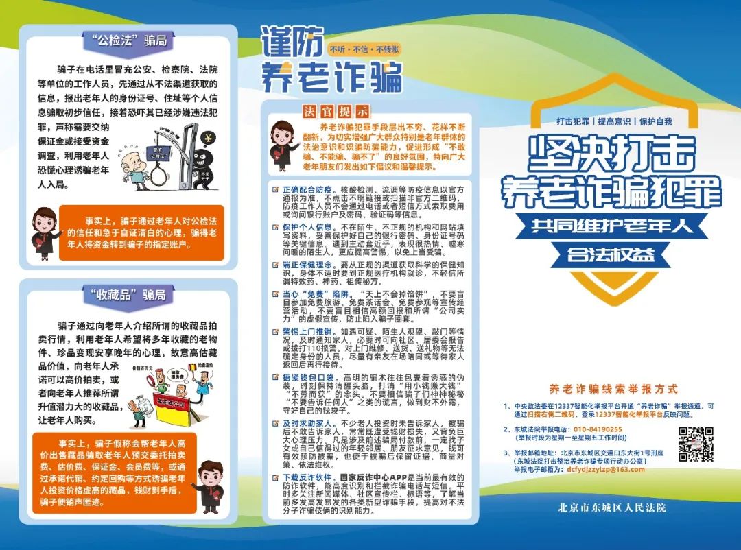 据东城法院刑事审判庭庭长姜在斌介绍,为确保老年人能够掌握预防养老诈骗的知识,东城法院刑事审判庭提前部署、周密谋划,专门总结了养老诈骗常见的八种骗局,并撰写了相关提示,还编写了预防养老诈骗的七字诀,并制作宣传展板,印制宣传手册。“我们借助疫情防控的契机开展‘疫’线普法,就是希望用通俗易懂的语言和大家喜闻乐见的方式,让群众尤其是老年人在排队的同时,能学到预防养老诈骗的知识,进一步提升他们的反诈意识。”姜在斌说。