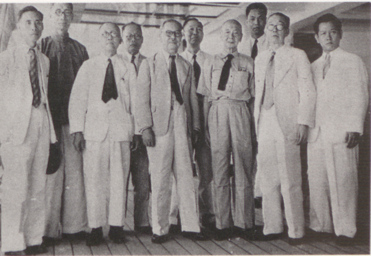 ▲图片说明:1949年5月,著名南洋侨领陈嘉庚启程回国,6月4日抵达北平。图为陈嘉庚(左五)与各界人士在船上合影。