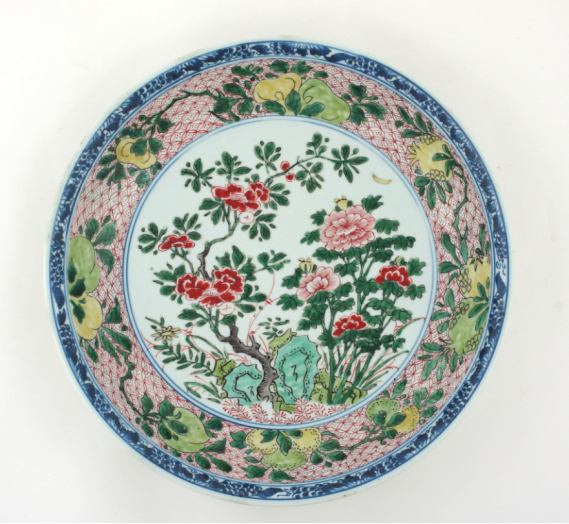 △五彩山石牡丹纹盘 清 康熙(1662-1722)