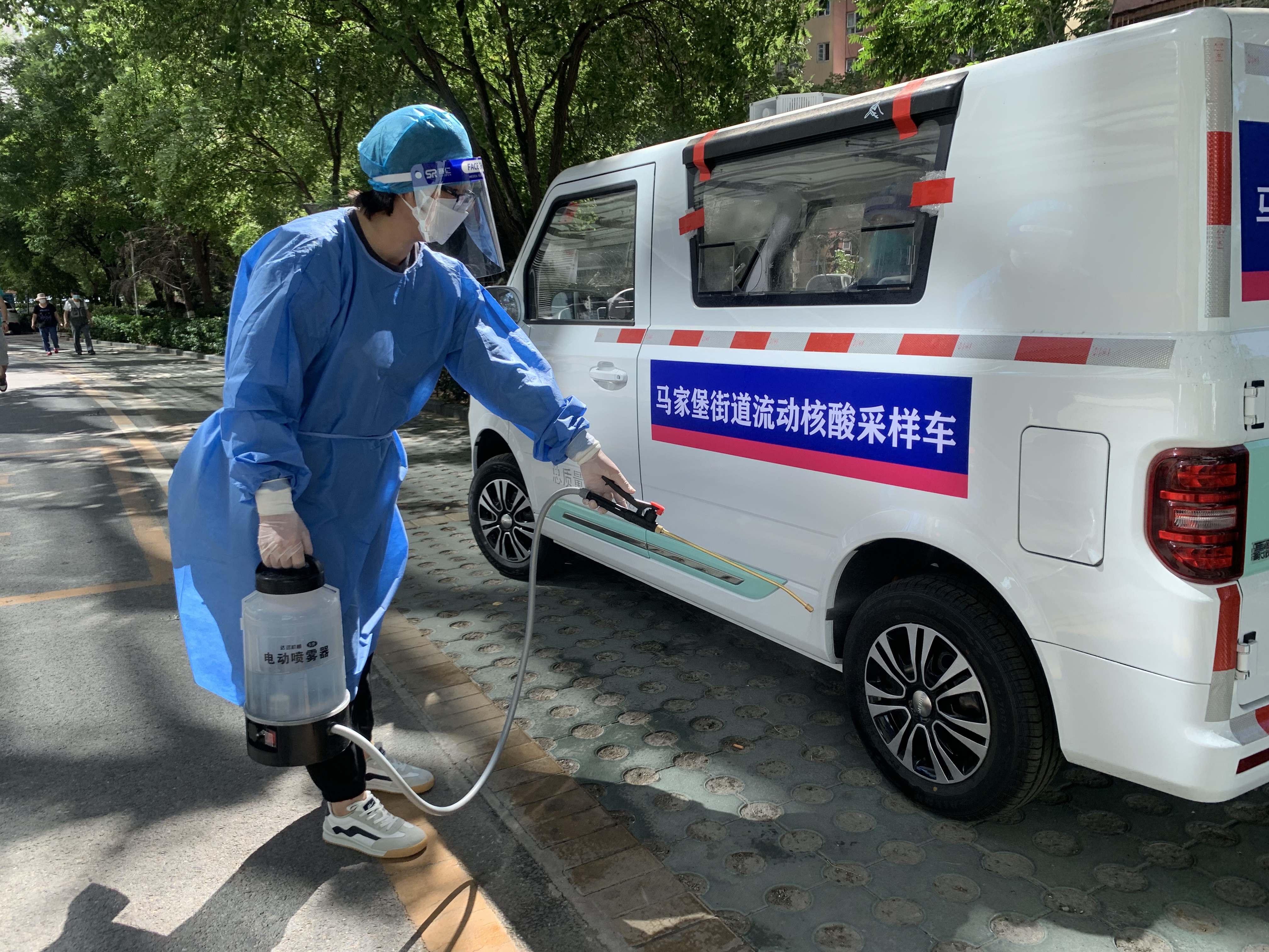 与商场经理通过电话后,沿着马家堡西路,他们一路开到了公益西桥华联商场停车场,这里有宽阔的空地,足够远离居民楼并用来停车。不少得到通知的每日必检人员已按两米线排起了长队,司机马上下车进行引导,登记人员已调好设备,下车为前来采样的冷链工作人员录入身份证信息,采样人员则从冰箱里拿出检测试剂,熟练地开始操作。左侧的大车窗上留出了两个可开合的检测口,避免了过多的接触从而保证了检测双方的安全。“不少居民觉得新鲜,都想体验一下我们这移动检测车,但为了与辖区居民分开检测,避免交叉传染,目前专为每日必检人员提供服务。虽说是便捷检测,可我们这操作不能图省事儿,排队的人员必须佩戴口罩且保持两米间隔。”说到这儿,司机拿出消毒喷壶,在检测车周围一丝不苟地做起消杀。