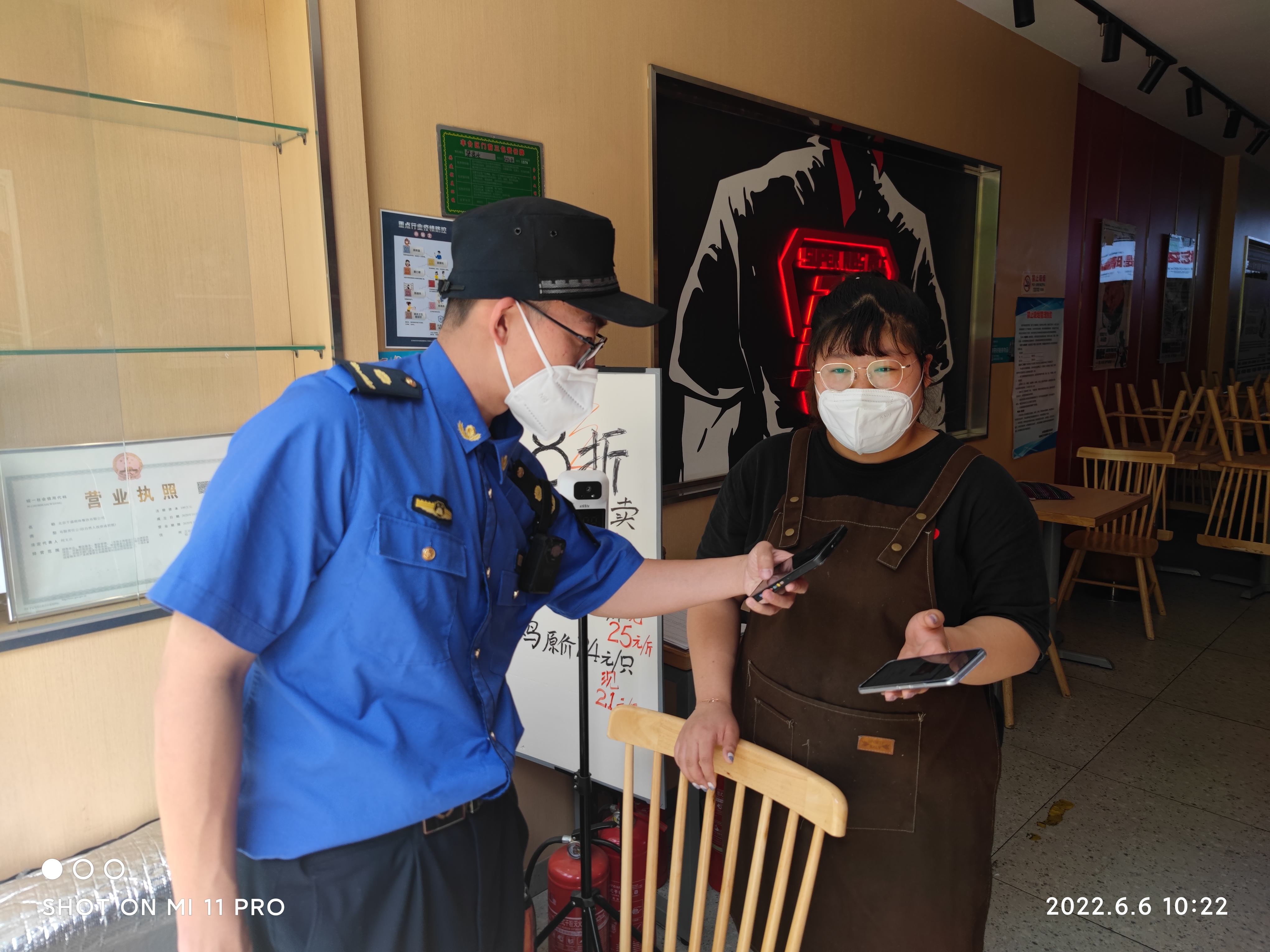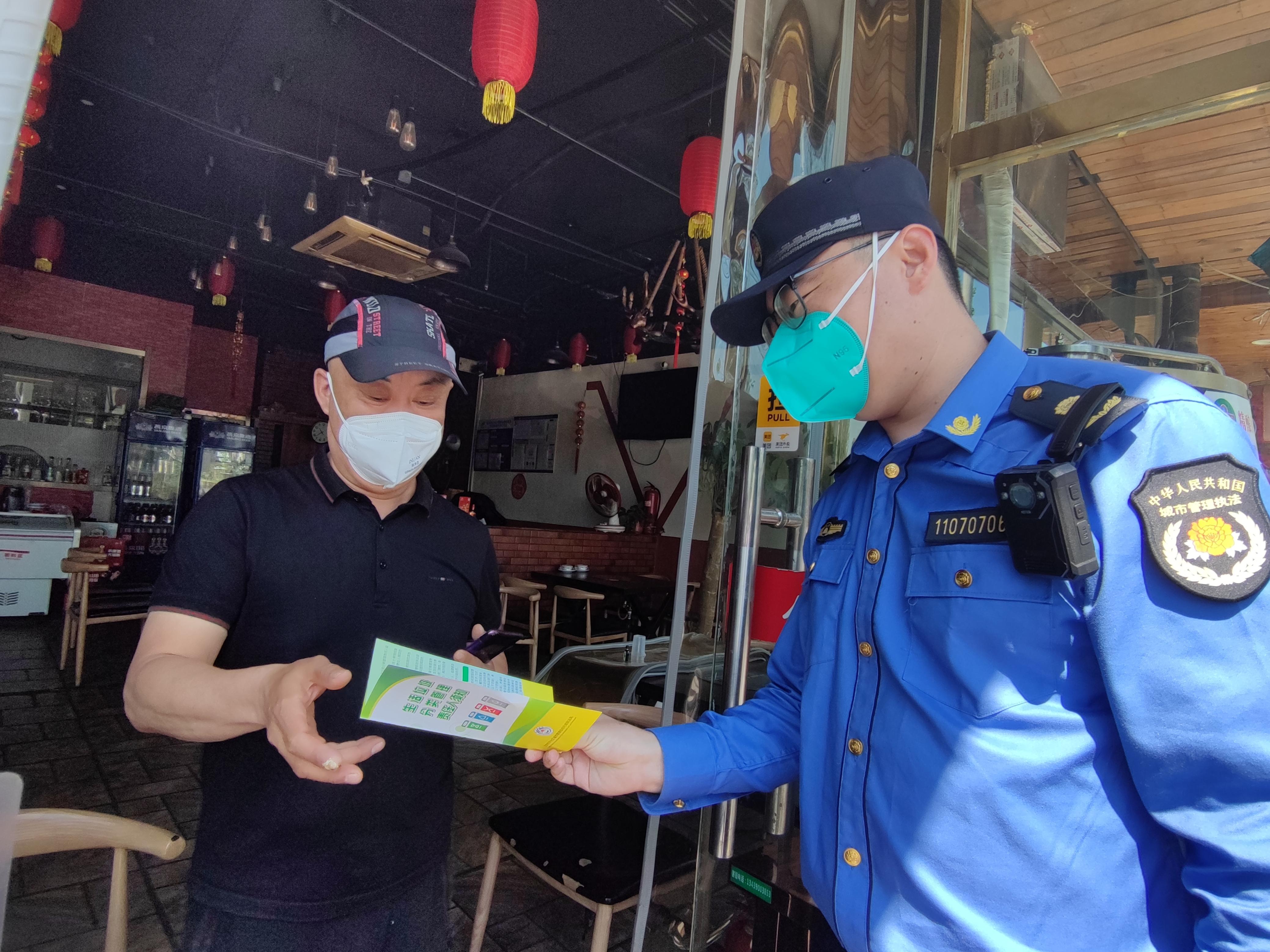 宋忠健、李施政作为街道综合行政执法队的中坚力量,连日来,他们带领队员们不舍昼夜,对辖区内的相关场所进行拉网式排查。在检查辖区内“三类场所”防疫情况时,对进入商场的群众进行提醒,对重点位置的消杀记录以及员工体温记录,并提醒商场工作人员:“‘四件套’要备齐,超市内的电梯间、扶手等消费者重点接触点位一定要消杀到位,并且要随时做好记录。”随着复工复产的有序推进,餐饮需求逐渐加大,对餐饮行业防疫工作也是一个严峻考验,为确保群众健康安全,他们对饮企业逐一摸排,检查消杀记录、员工体温监测记录、非就餐隔离区设置后,在指导督促餐饮店做好店内消杀、测温登记、佩戴口罩等防疫举措后,又带领队员,对燃气安全、垃圾分类等逐一进行检查,保障餐饮企业安全有序开工营业。对辖区内商务楼宇开展疫情防控执法检查的时候,执法队员重点检查测温,扫码,公共区域消毒,楼内办公人员佩戴口罩,商务楼宇内通风换气及单位内部人员进出京及流动情况,责令物业单位加强对入驻企业的管理,“严防死守”疫情防控薄弱环节。