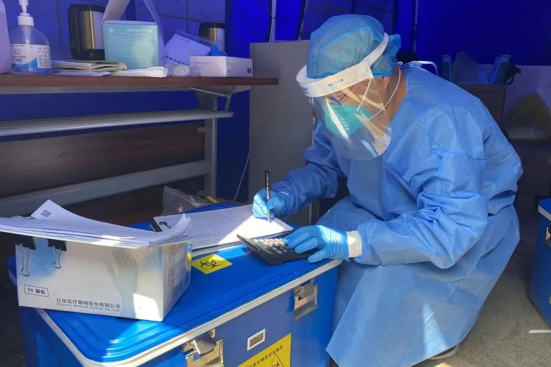 每到一个采样点,他们就立即检查样本完好程度、核对样本数量、登记转运记录单并进行消毒,然后封箱。“在转运前我会协助采样点位负责人再核实一遍数字,因为不仅要对自己的工作负责,更要对这个采样点几百个、几千个家庭的健康安全负责。”杨君说道,转运的任何环节都容不得一丝马虎。因此,对于他们而言,工作的每一刻都要打起十二分的精神。