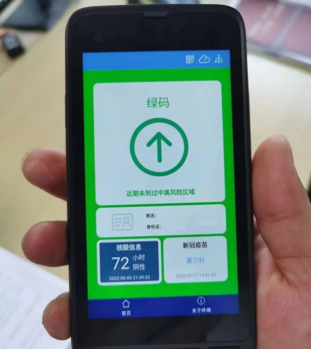 刷身份证的方式则更加快速。记者拿出身份证贴近设备上的核验部位,脸部朝向“电子哨兵”的摄像头。随后,设备也迅速显示出健康等信息,整个过程约2秒钟。