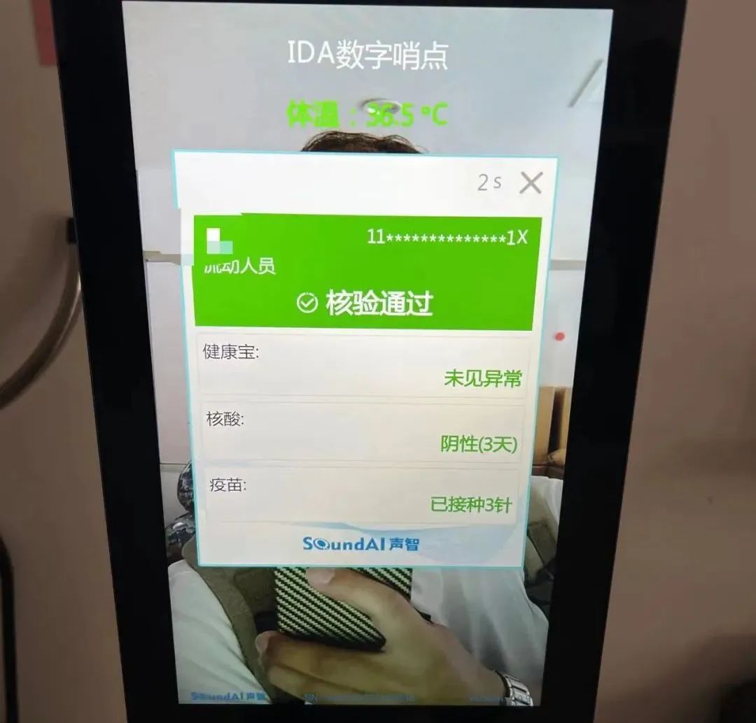 在新街口街道南小街社区国英一号楼宇的IDA数字哨点设备试用“上岗”,记者想要通过这台“电子哨兵”有三种方式。记者首先在设备上,输入姓名和身份证号进行核验。即刻,“电子哨兵”屏幕上就显示出了记者的姓名、身份证号的部分信息,以及实时体温、健康宝绿码和核酸状态。同步,语音提示记者允许通行。整个测温、核验过程不超过5秒钟。