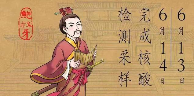 6月13-14日这轮核酸检测贴纸上,齐国大夫鲍叔牙与大家见面。
