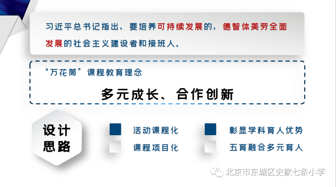 2021年“双减”政策落地,同年北京市东城区提出了教育综合质量与队伍建设质量“双提升”三年行动计划,史家七条小学为了推动学校整体发展,在史家教育集团提出“无边界课程”理念的基础上,充分挖掘七小特色,积极构建了具有七条校区特色的“万花筒”课程体系,并提出了“合作创新 多元成长”的课程培养目标。