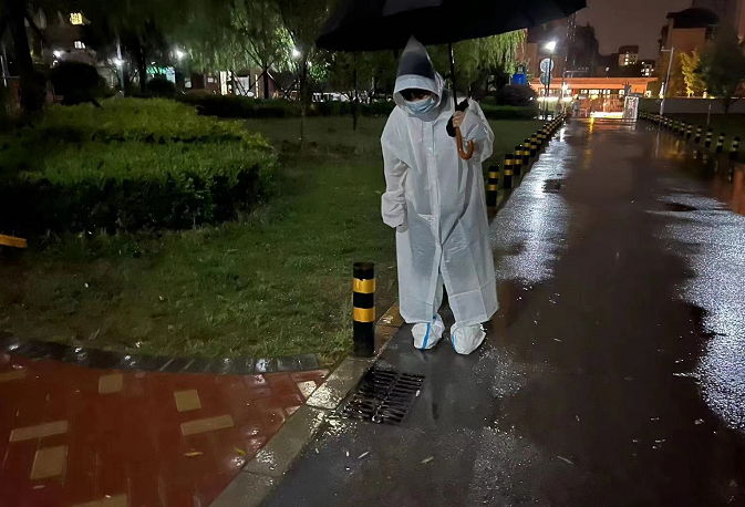 图释:金成裕雅苑社区工作人员查看辖区排水情况