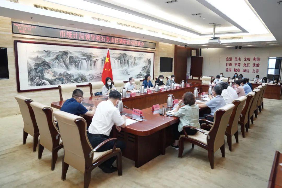 李素芳一行先后到中国电科(北京)智能科技园、瞭仓艺术馆、中关村科幻产业创新中心(元宇宙中心)进行实地调研,随后在石景山区政府召开座谈会,听取了石景山区统计工作及经济运行等情况汇报。
