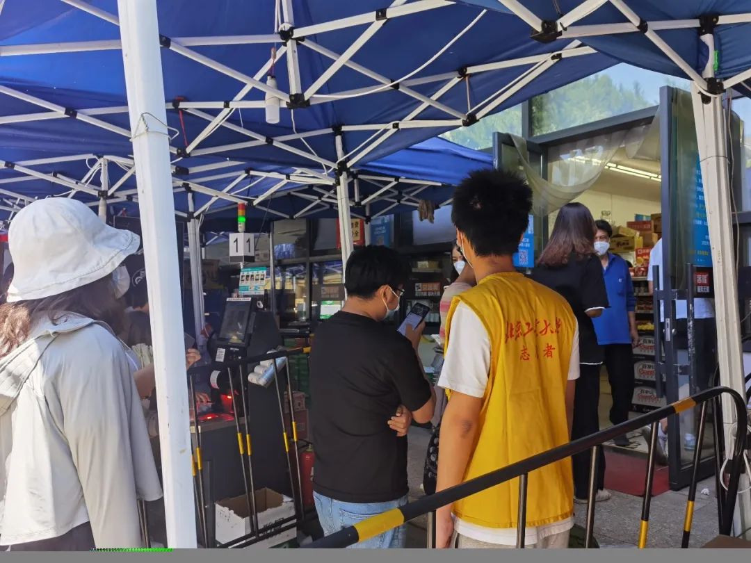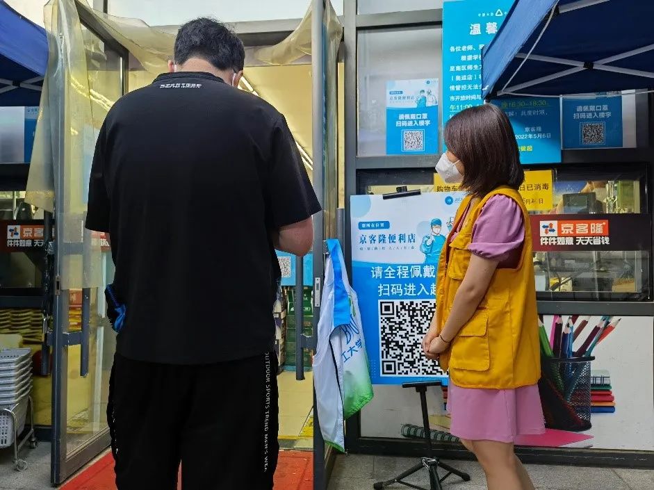 为能确保同学们平稳、有序进入超市购物,志愿者们在校园超市引导师生扫码入场,提醒师生正确佩戴口罩,协助工作人员合理控制入店人数。