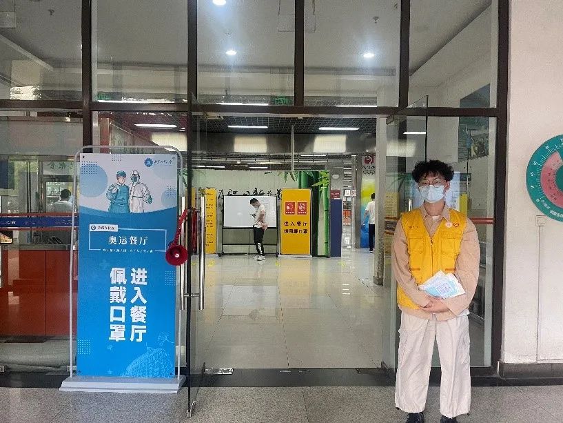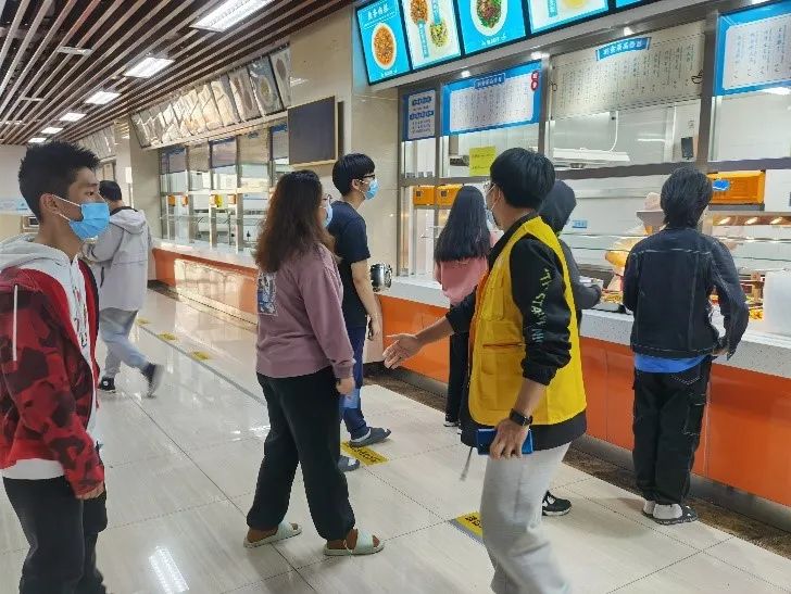 为配合做好学校暂停堂食服务的保障工作,志愿者们在校内各食堂门口、购餐档口提醒同学们佩戴好口罩、打包餐食、保持安全排队距离,引导同学们按照单向流线进出食堂。