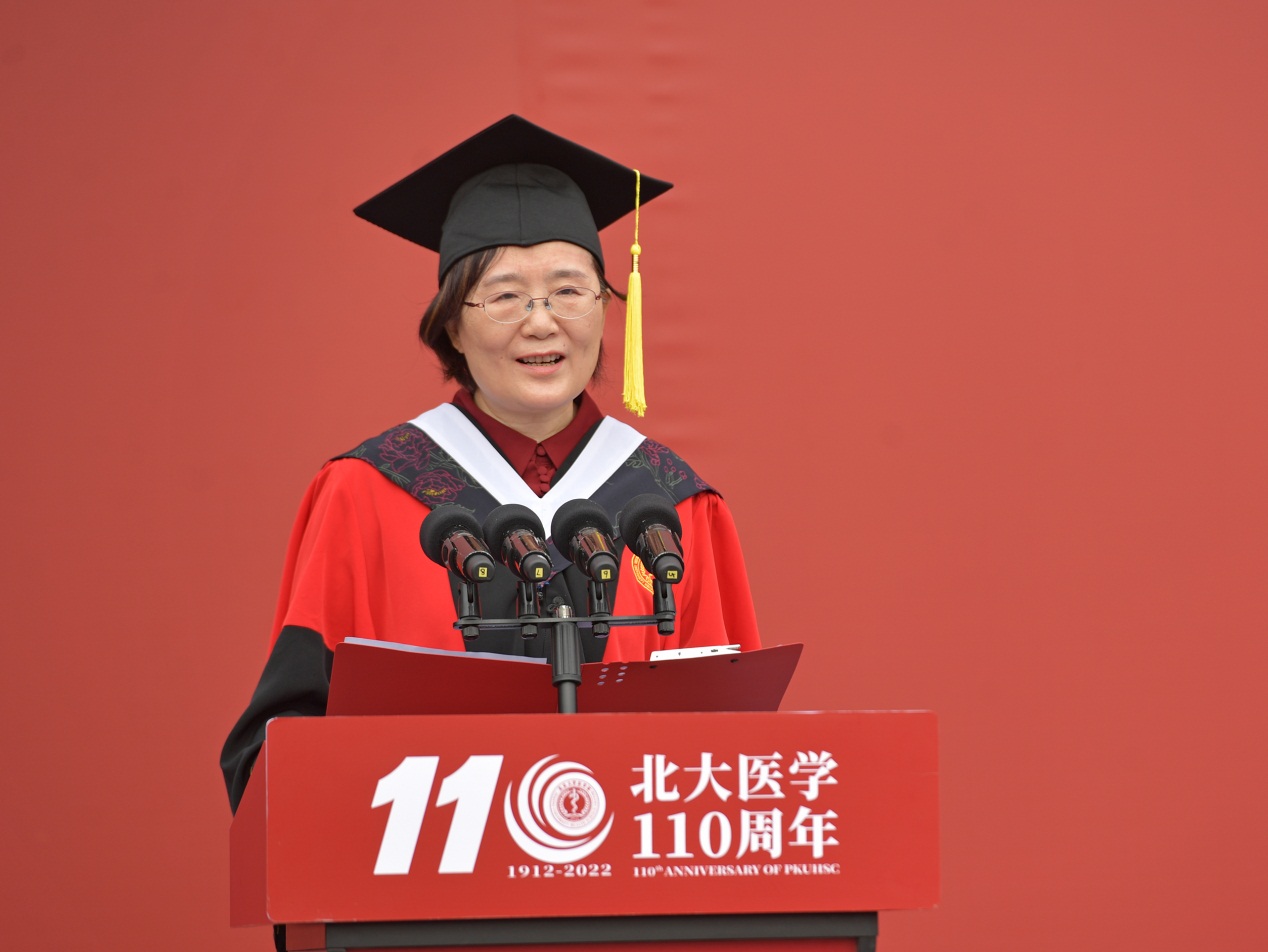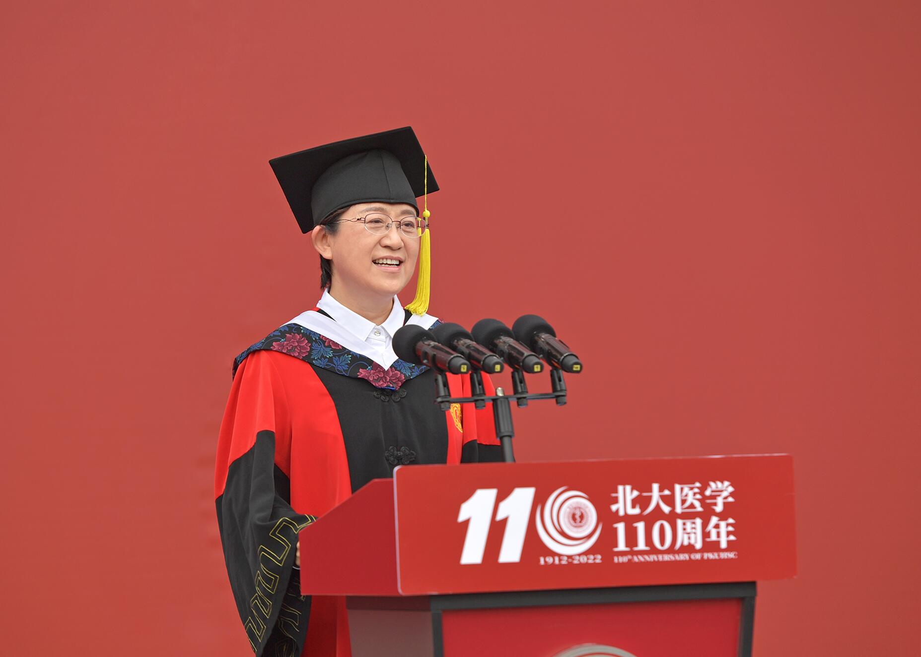 “北大医学始终秉承‘厚道之心’,顺境不骄,逆境不畏,砥砺前行,永远走在祖国和人民需要的第一线,是医学教育的高地和医疗卫生事业的重地。”乔杰勉励毕业生们要在逆境中求生存,锤意志,创卓越。第一,逆境中求生存。她希望大家不向逆境低头,不向挫折妥协,不向挑战退让,永远充满活力的追寻绚烂如夏花般的人生。第二,逆境中锤意志。希望大家用一颗坚韧之心,久久为功,在不断锤炼意志的过程中将自己修炼成材,成为真正的良医、大医,创造出一个又一个医学突破。第三,逆境中创卓越。希望大家顺时朝夕求索,困时直面不避,于困局中育新机、于变局中开新局,展现北医人的智慧与豪情,书写北大医学未来的荣光。乔杰希望毕业生们不负时代,不负韶华,立足新时代,勇踏新征程,把对祖国血浓于水、与人民同呼吸共命运的情感融汇在事业追求中,让青春之花绽放在党和人民最需要的地方。“110年的北医将伴你腾飞,永远做你们最坚强的后盾,为你们搭建最宽广的舞台,希望你们能够与北大医学共同成长!”