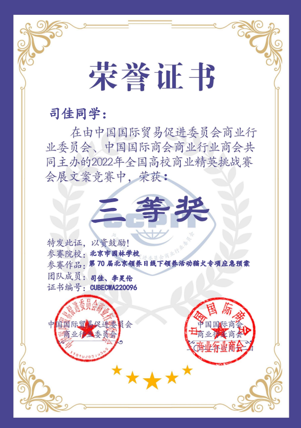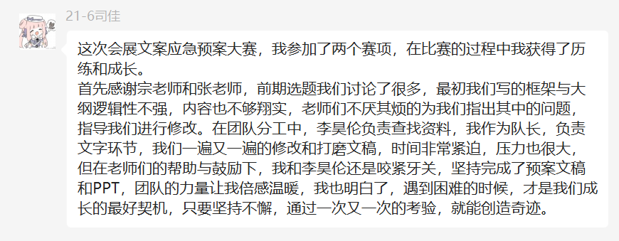 2021级司佳、李昊伦团队,获全国高校商业精英挑战赛会展文案(应急预案)比赛三等奖;
