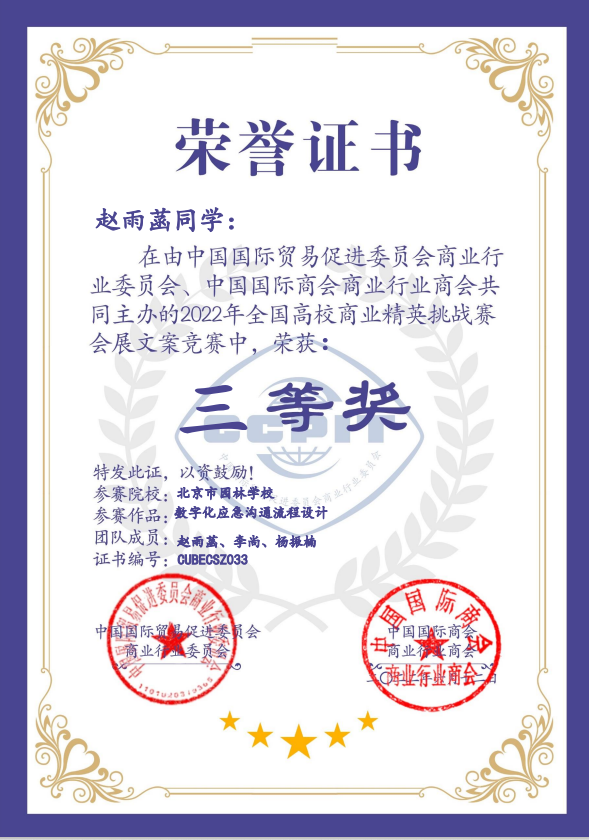 2021级赵雨菡、杨振楠、李潇赫团队,获全国高校商业精英挑战赛数字化应急沟通流程设计比赛三等奖;