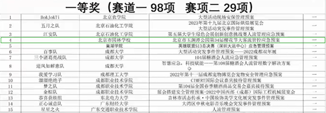 学校参赛团队全部获奖,其中会展文案(应急预案)写作竞赛获一等奖1项、三等奖1项,数字化应急沟通流程设计竞赛获二等奖1项、三等奖1项。