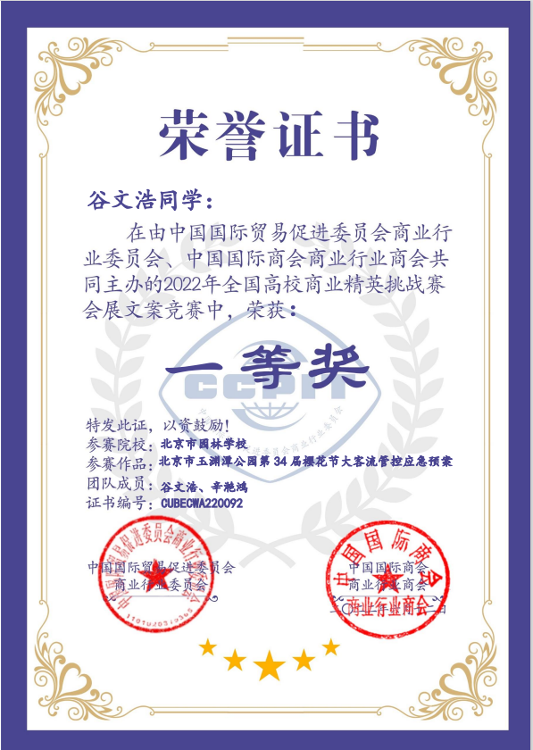 2020级谷文浩、辛滟鸿团队,获全国高校商业精英挑战赛会展文案(应急预案)比赛一等奖;