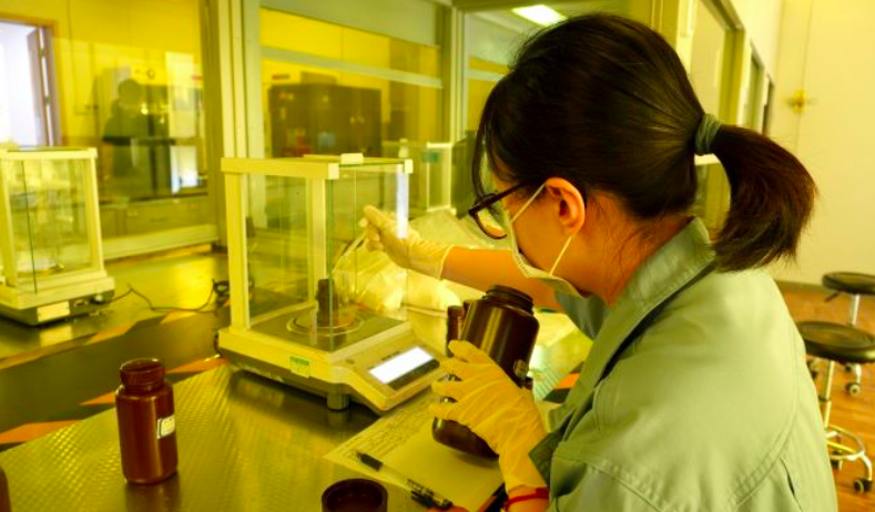 技术人员在黄色灯光条件下研发配制光刻胶。孙艳平/摄