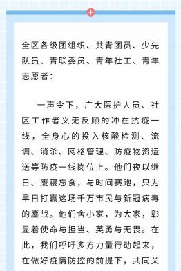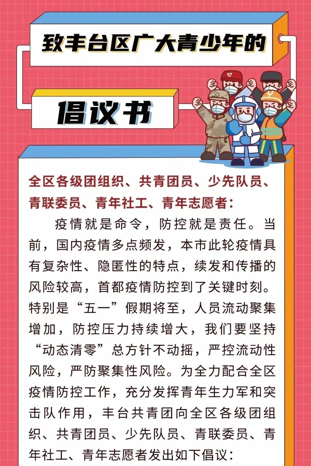 第一时间发出《致丰台区广大青少年的倡议书》《关心关爱社区一线抗疫人员倡议书》《用战疫礼赞青春倡议书》,吹响抗疫“集结号”,号召各级团组织和广大团员青年立即行动、积极作为,科学有序参与疫情防控工作,全力服务大局。
