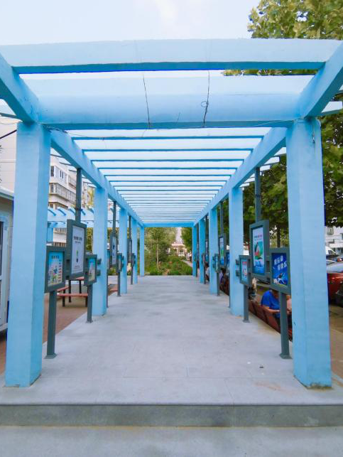 科普长廊由于长期风吹日晒,地面出现了不同程度的破损、墙面宣传画老旧,居委会对其进行了全面翻新。