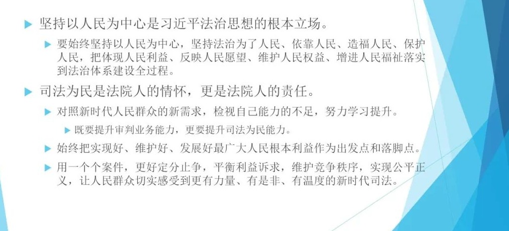 习近平总书记强调,“始终坚持以人民为中心,坚持法治为了人民、依靠人民、造福人民、保护人民,把体现人民利益、反映人民愿望、维护人民权益、增进人民福祉落实到法治体系建设全过程”。司法为民是法院人的情怀,更是法院人的责任。我们将不断对照新时代人民群众的新需求,检视自己能力的不足,努力学习提升。用一个个案件,更好定分止争,平衡利益诉求,维护竞争秩序,实现公平正义,让人民群众切实感受到更有力量、有是非、有温度的新时代司法。