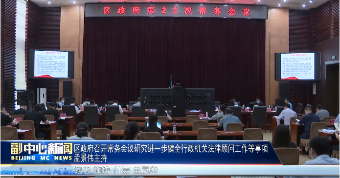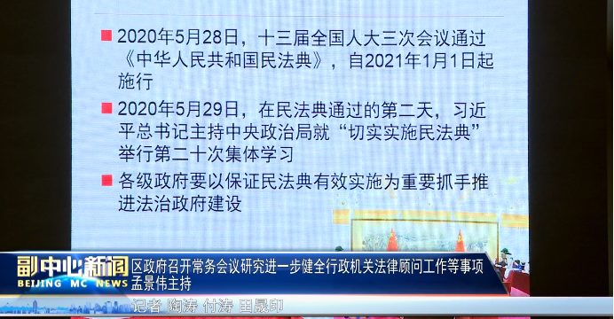 6月21日下午,区政府召开常务会议,集中进行《学习贯彻民法典,全面推进依法行政》学习,研究《北京市通州区关于进一步健全行政机关法律顾问工作的若干措施》和《通州区行政机关外聘法律顾问工作管理规定》等事项。区委副书记、区长孟景伟主持会议。