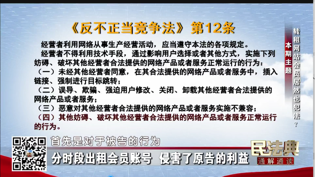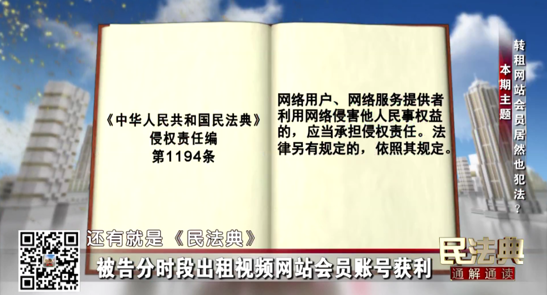 近日,北京知识产权法院法官马兴芳受邀参加北京电视台科教频道《民法典通读通解》栏目,就出租视频网站会员案,围绕《中华人民共和国民法典》侵权责任编第1194条、《中华人民共和国反不正当竞争法》第12条等展开解读。