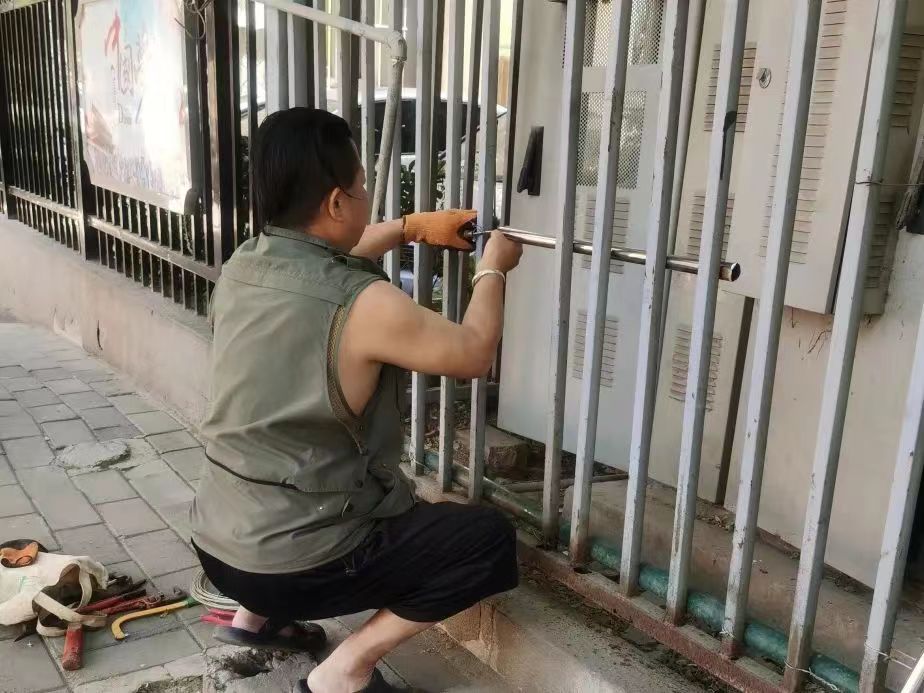 接到居民反映后,海淀街道三义庙社区工作人员立即联系志愿者对围栏处做了现场核查,确定所需的材料后,火速开展修复工作。由于疫情原因,五金材料无法采购,志愿者郜师傅针对临街护栏钢筋封条缺失的情况就地取材,将木棍和钢管按尺寸截好后用铁丝固定在缺口处,经过两个小时的修整,在省时省料的同时极大程度保留原有护栏完整性及协调性。