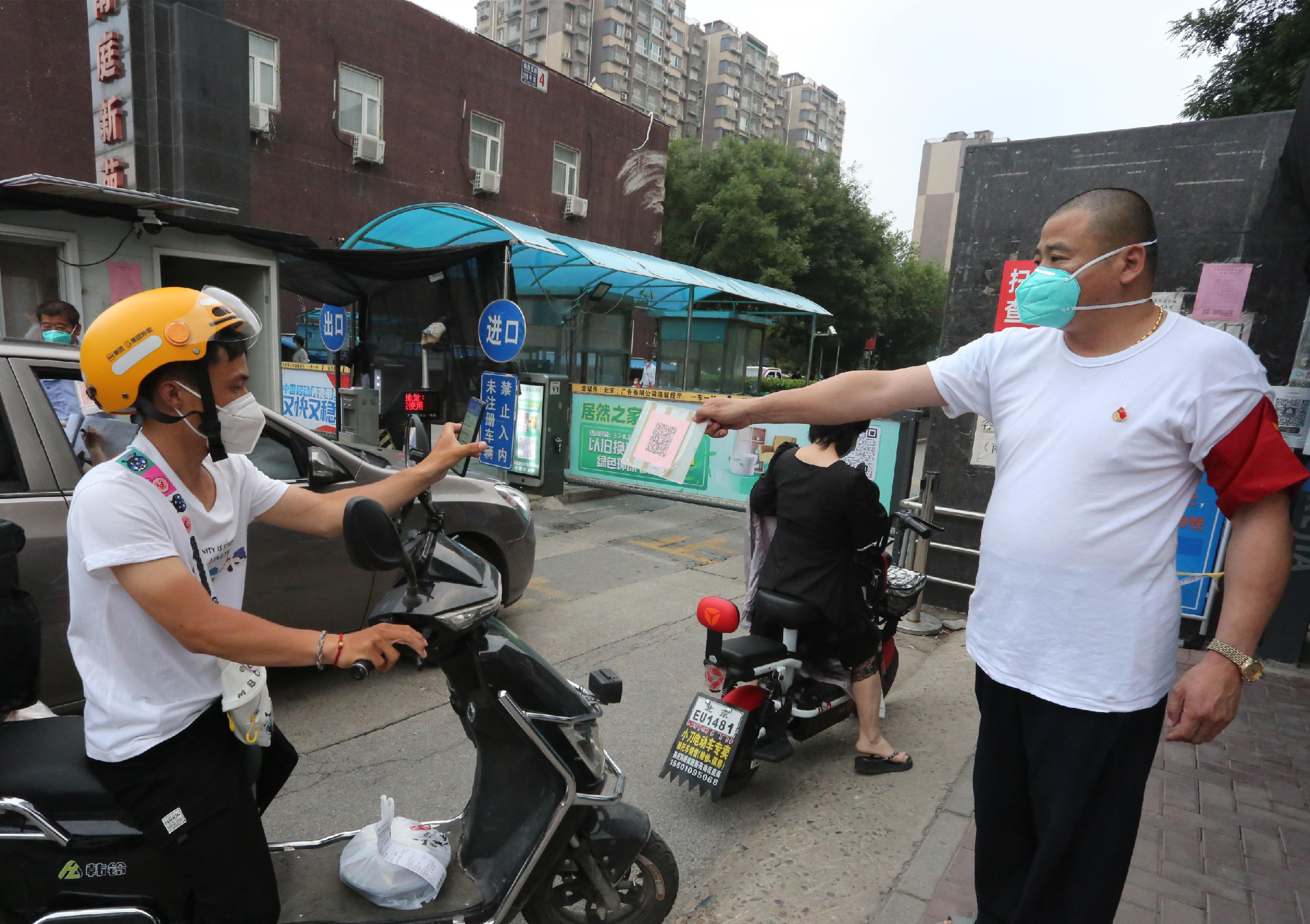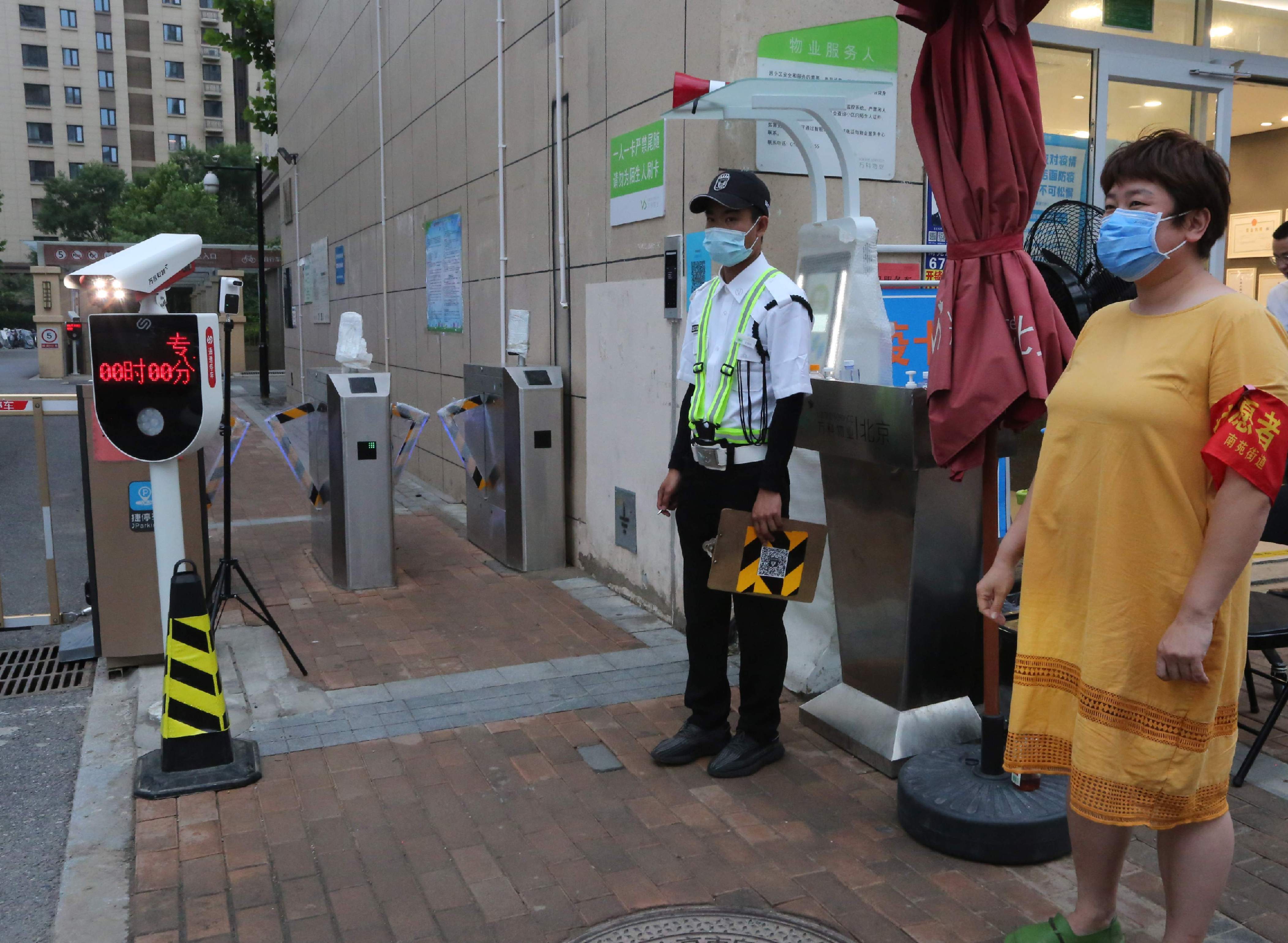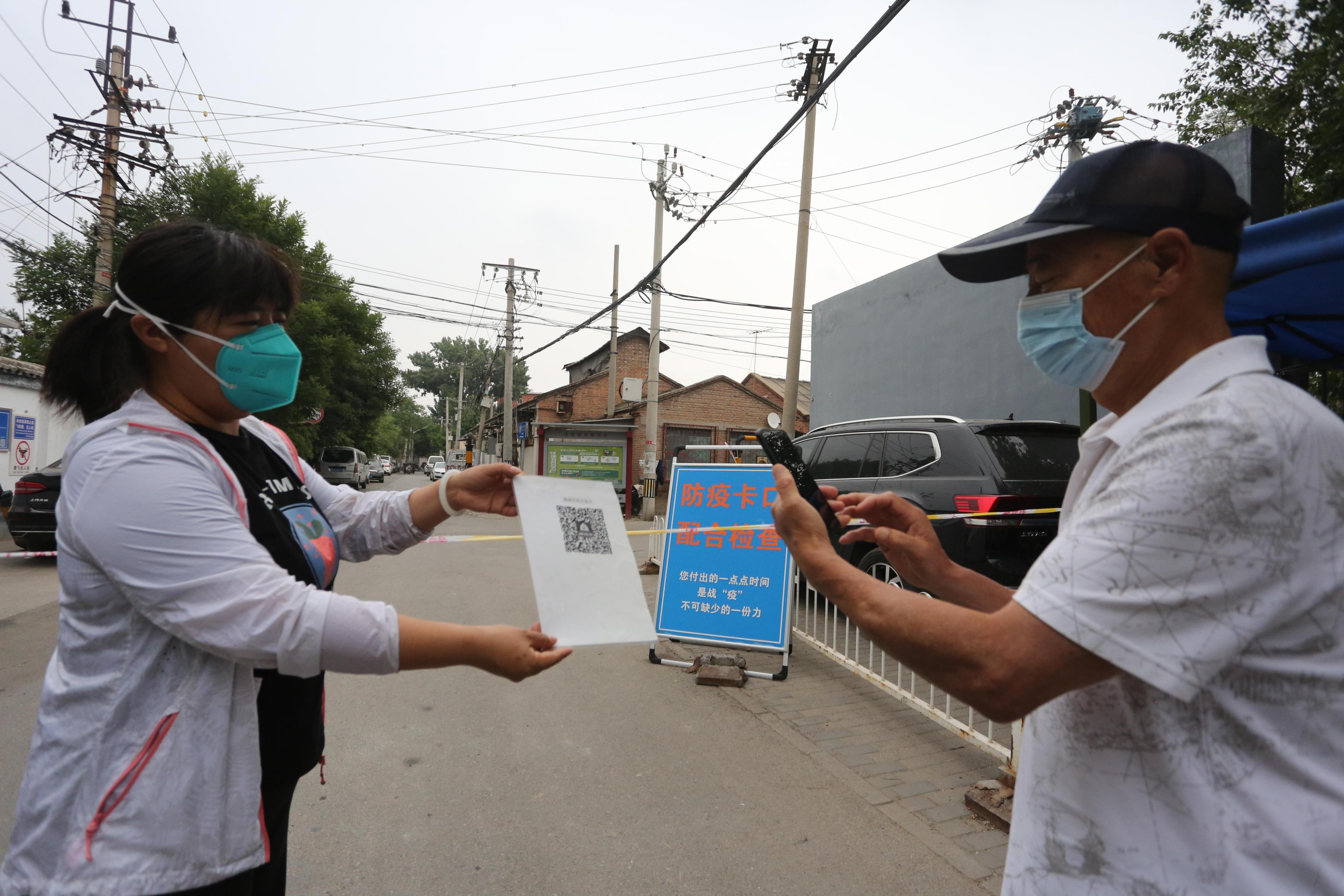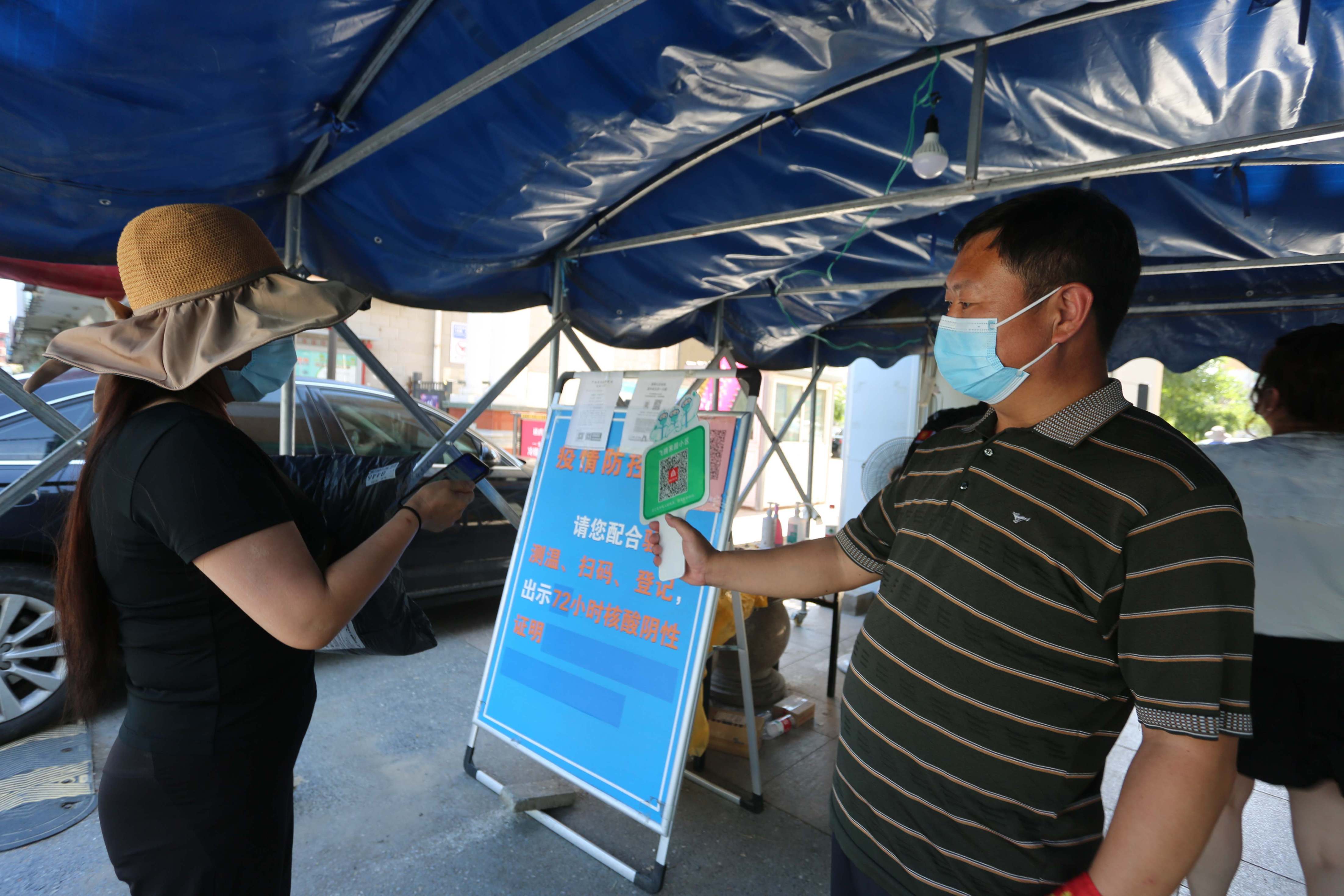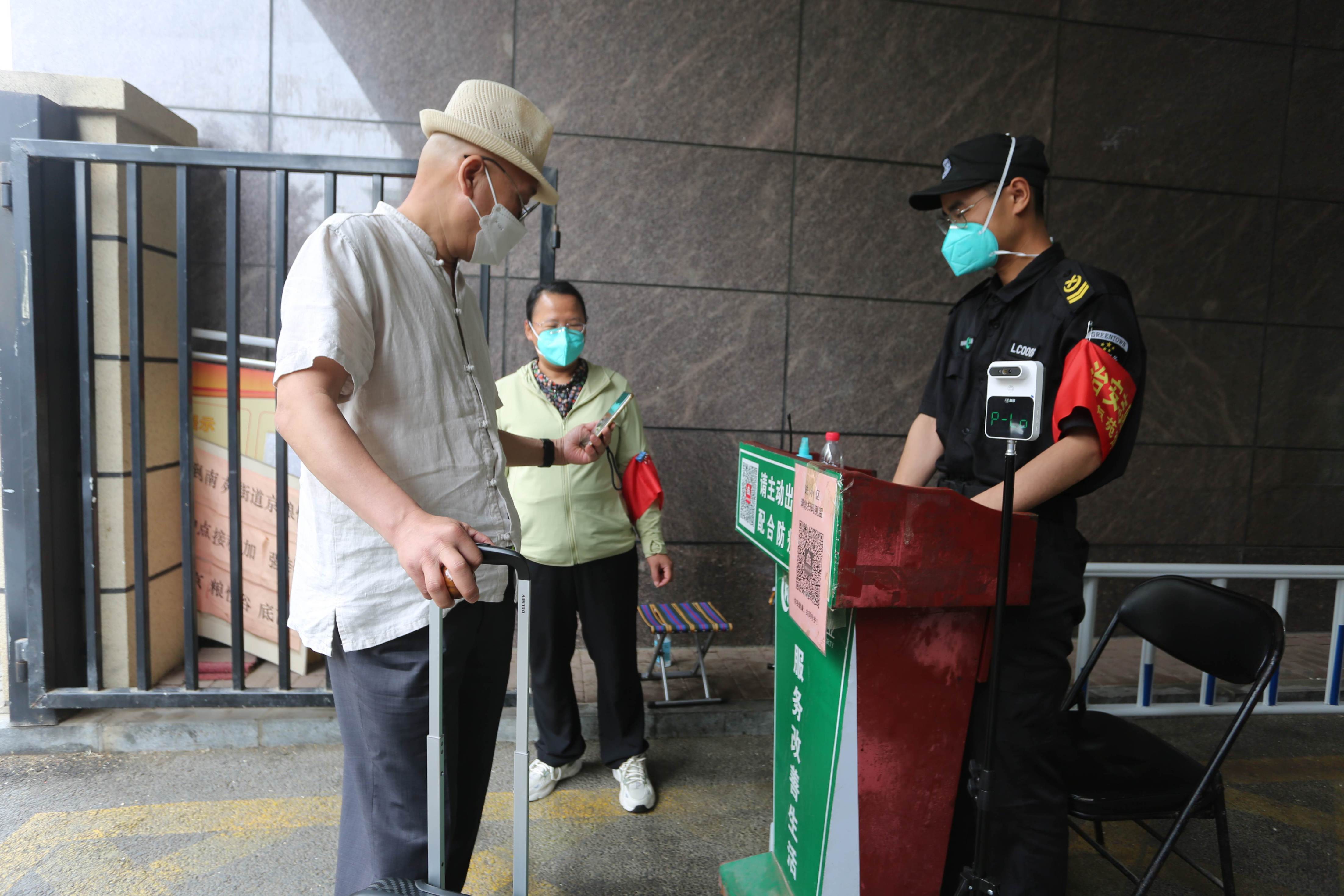 “大妈,请您扫码测温,出示出入证”6月21日,天气闷热难耐,在南苑大泡子卡口,正在值守的南苑街道综合办公室科长王婧认真查验着每一位进入小区的人员。“这大热天儿,辛苦你们了!”老人面带微笑,话语中透着心疼。老人边说边掏出手机扫码,侧身抬手对准测温计测温。