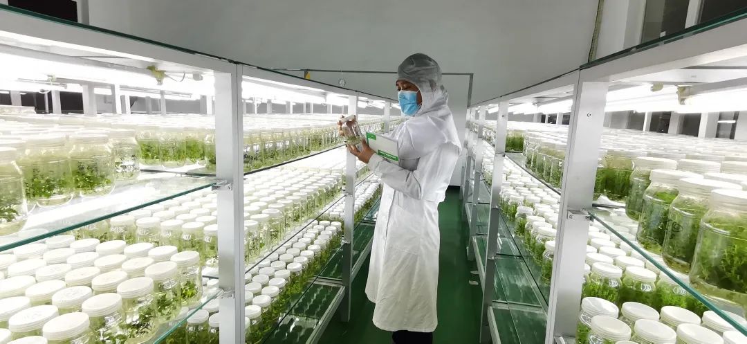 近日,在北京希森三和马铃薯有限公司的培养室内记者看到,“脱毒”薯苗的绿茎末端连接着嫩绿的新叶,一棵棵紧紧簇拥在一起,在实验瓶内恣意生长, 呈现出一派郁郁葱葱的景象。