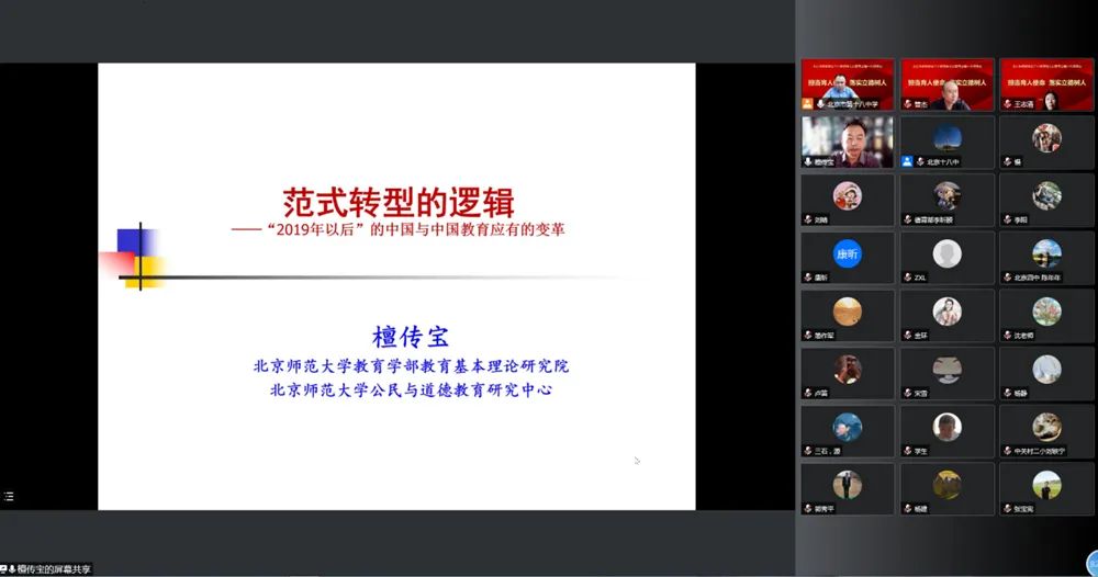 北京师范大学教育学部教授、北京师范大学公民与道德教育研究中心主任檀传宝进行了《范式转型的逻辑——“2019年以后”的中国与中国教育应有的变革》专题讲座。檀教授指出,2019年国家宏观经济与教育普及发生了重大变化,引发了人口结构的变化和教育需求类型的升级,产生了物质丰裕时代德育的空前挑战。要解决这个重大问题,需要从教育内部和教育外部两方面入手,扎实推进教育品质的提升,妥善处理社会与教育的关系,逐步促进整个教育生态发生改变。