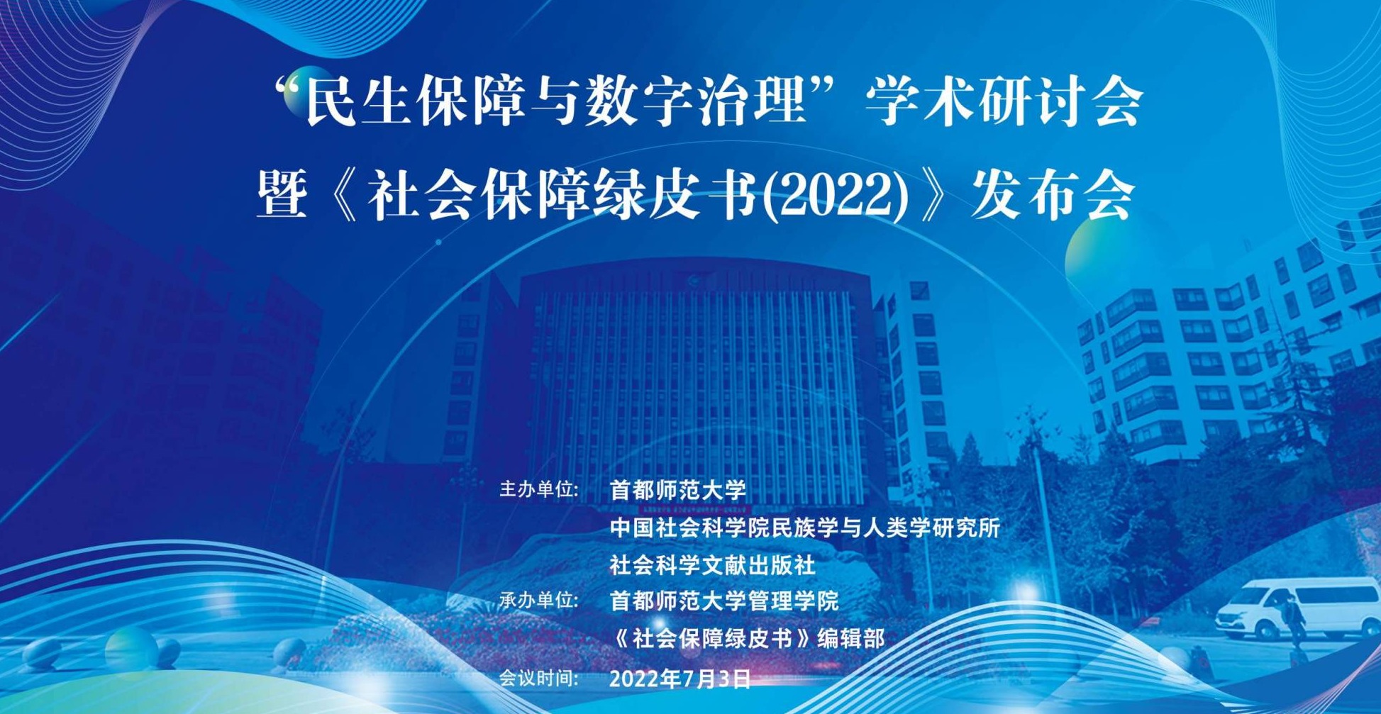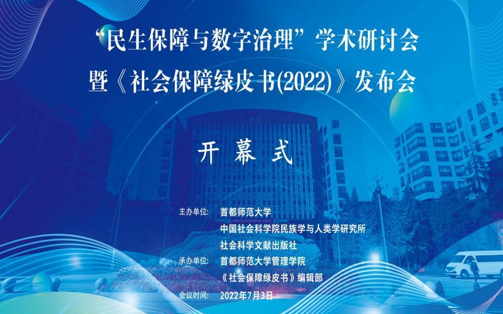 7月3日,由首都师范大学、中国社科院民族所、社科文献出版社共同主办,管理学院承办的“民生保障与数字治理”学术研讨会暨《社会保障绿皮书(2022)》发布会在线举行。出席会议的领导和嘉宾有全国人大常委、民盟中央副主席郑功成,中国社科院美国所原所长郑秉文,中国劳动保障科学研究院原院长金维刚,中国社科院民族学所党委书记赵天晓、所长王延中,社科文献出版社社长王利民,来自中国社科院、中国社会保障学会、北京大学、清华大学、中国人民大学、浙江大学、南京大学、厦门大学、上海交通大学、中国矿业大学等50余家单位的专家学者、研究生和媒体参加了会议。我校党委书记孟繁华,党委常委、纪委书记李丽辉,社科处处长赵新峰、科技处副处长张玉虎、研究生院副院长胡德勇、管理学院班子成员、部分教师和研究生参加了会议。
