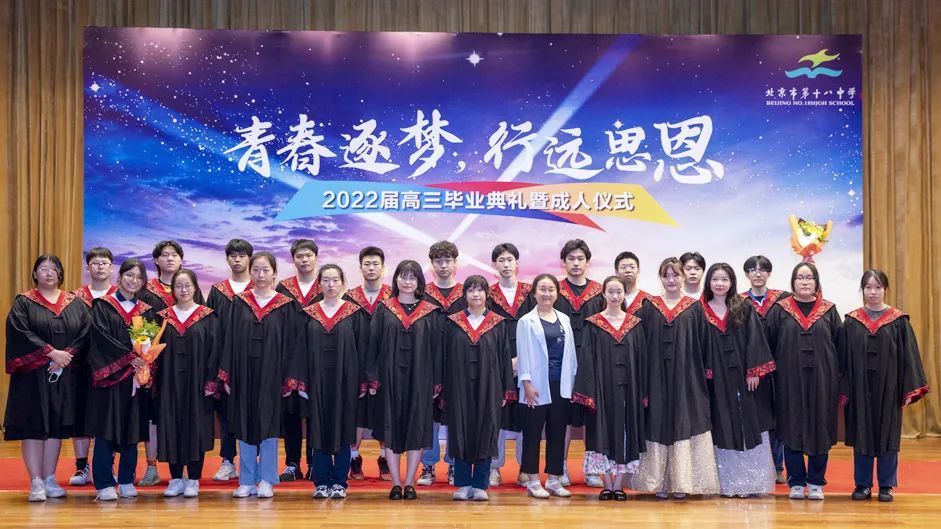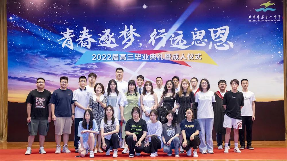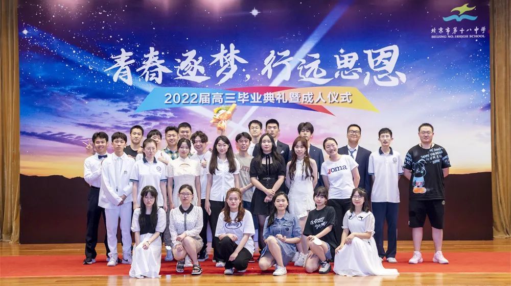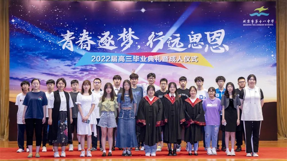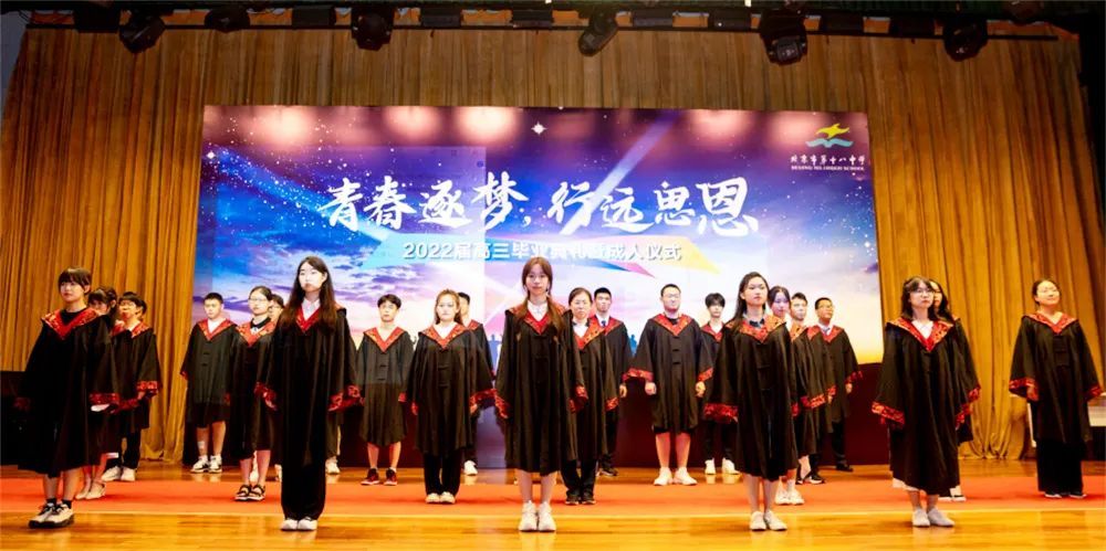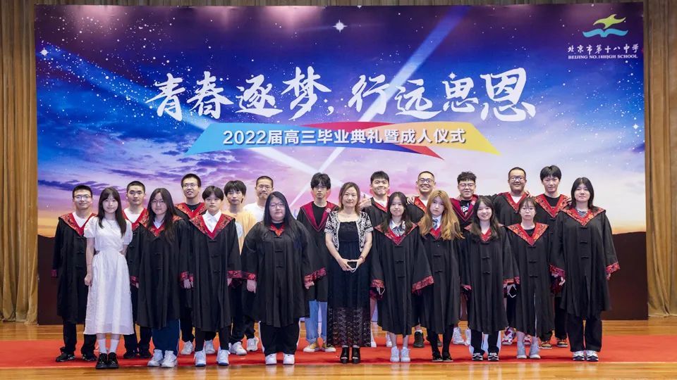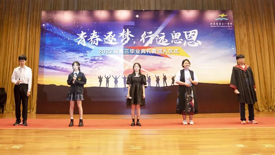 “现在我宣布,‘青春逐梦 行远思恩’——北京市第十八中学2022届毕业典礼暨成人仪式,现在开始!”典礼在主持人何宗怡、隗立恒同学的宣布声中,拉开帷幕。