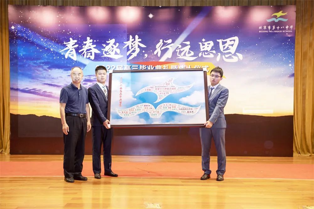 每一位同学的成长都离不开母校的培育。高三年级的全体学子们为母校精心准备了一份特殊的“毕业礼物”。我们有千言万语道不尽对母校的感激之情,在这离别之际,我们对母校的深情厚谊浓缩在这十八中的logo中,这里记录了我们2022届毕业生的名字以及留给母校的感恩祝福语。高三(1)班朱博政同学和刘宇辰同学代表毕业生向母校赠送这份礼物。魏韧书记代表学校接受赠礼。