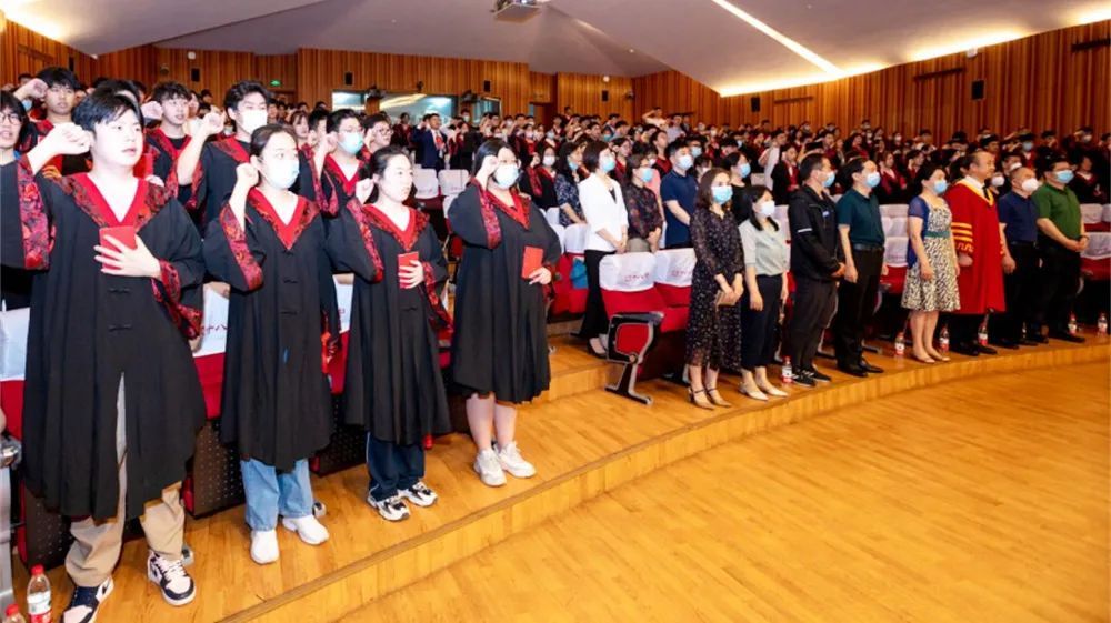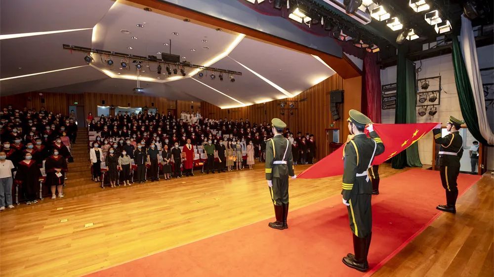 大会第一个环节是敬国旗、唱国歌,护旗手们庄重地拥举国旗入场,国歌回响在音乐厅的每一个角落。全体师生起立齐唱国歌,目光投向国旗,行注目礼,庄重严肃。
