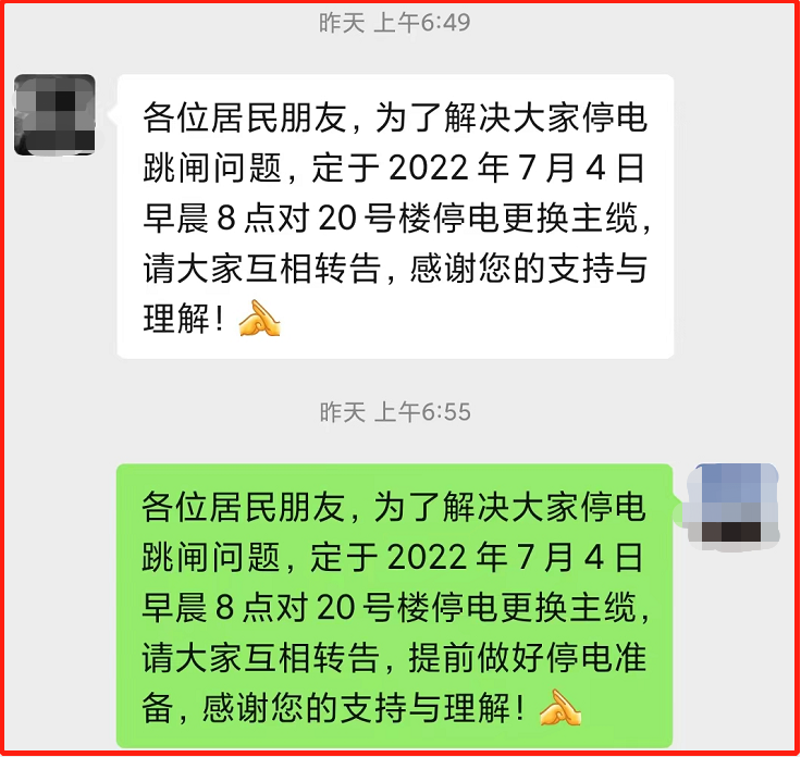 白露雅园东区是后沙峪镇老旧小区之一,已建成近20年,部分地下电缆使用年限较长,出现老化现象。7月4日00:45分,小区20号居民楼至配电箱之间的电缆出现故障,导致整栋居民楼断电。