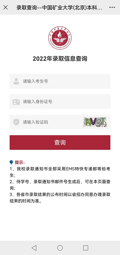 我校将在各省录取结束后及时公布录取结果,请广大考生及家长耐心等待,持续关注中国矿业大学(北京)本科招生网,按照下文中录取结果查询方式进行查询,同时也请关注本省考试院网站。