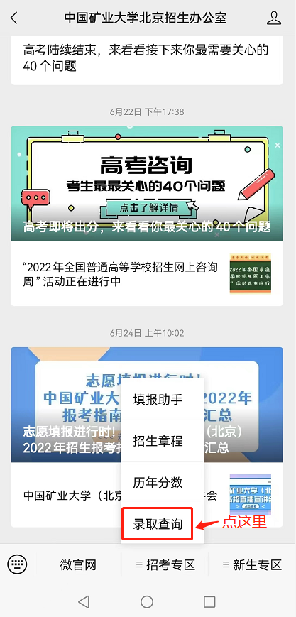 1、点击下方菜单栏—>招考专区—>录取查询。