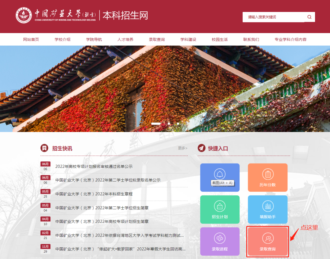 1、进入我校本科招生网(http://zb.cumtb.edu.cn),在快捷入口中点击“录取查询”。