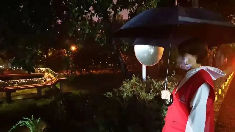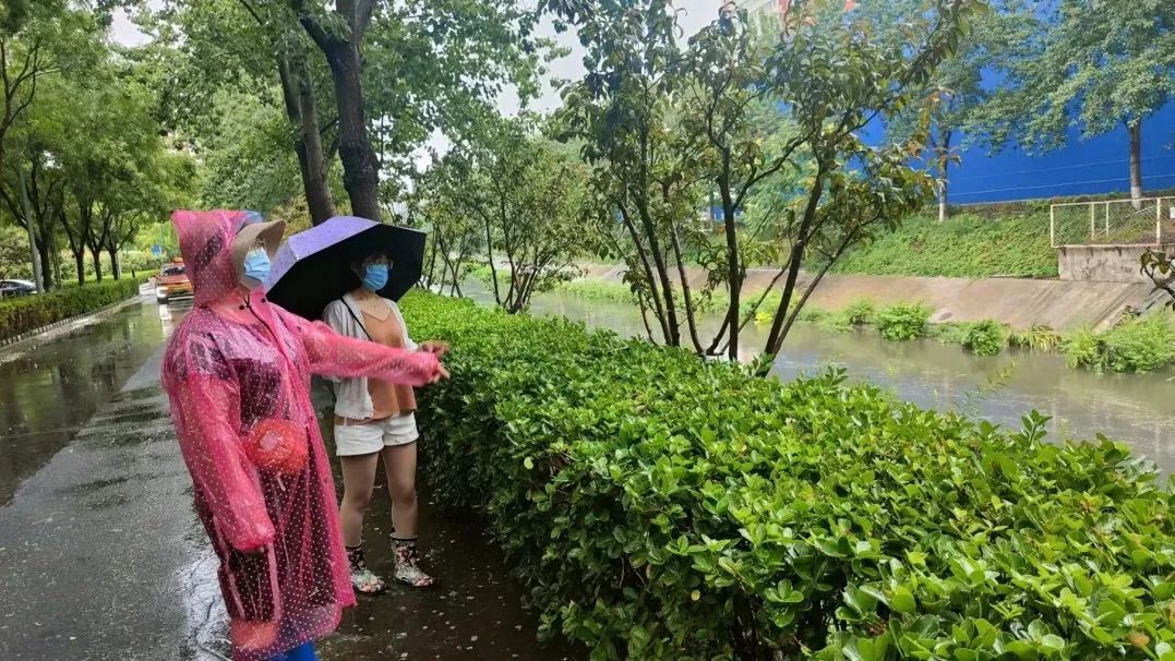 “雨大路滑,您小心滑倒!”在朗琴园社区,防汛人员朱虹发现一处积水路段,一边向工作群内汇报情况,一边随时提醒路人注意出行安全。