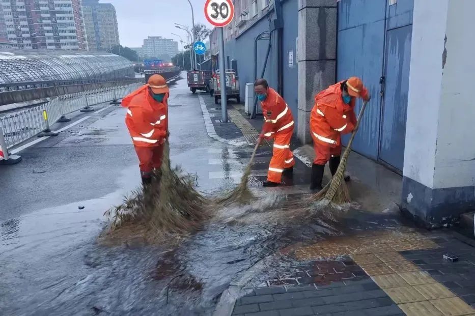 ⬆️环卫工人用扫把等工具及时清理道路积水