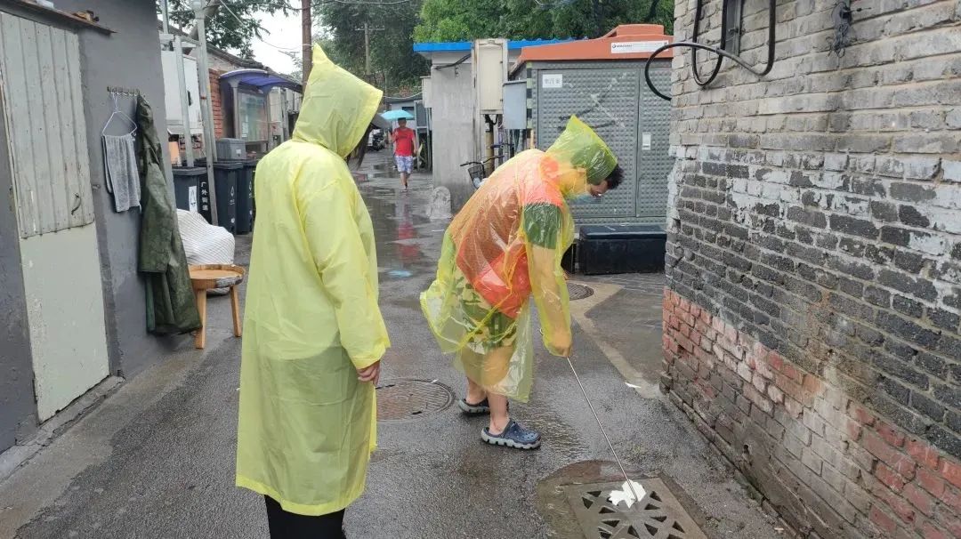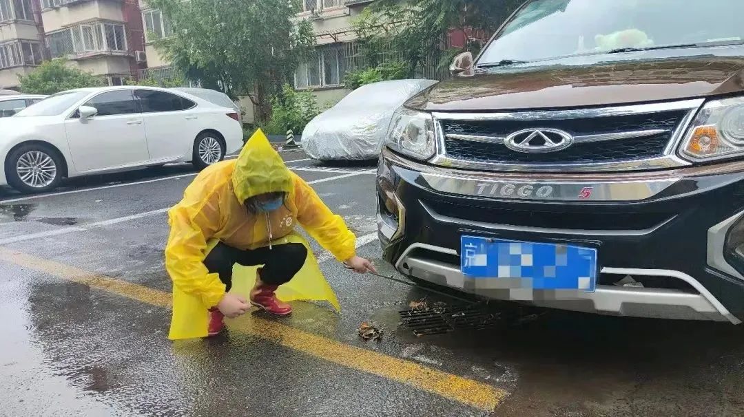 处理完这一情况后,朱虹继续巡查,她一次次弯腰蹲在地上,仔细查看每一处雨箅子有没有被堵塞。一旦发现下水不畅的地方便及时清理,遇到自己无法立即解决的,她便及时在工作群汇报情况,请求支援。