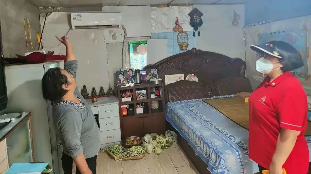 在湾子街小区,工作人员正在挨家挨户检查居民家的房顶是否漏雨。