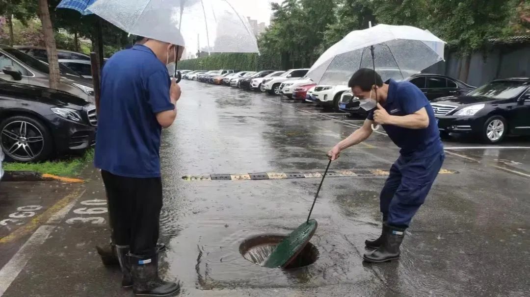雨势较大时,个别路段积水严重,防汛人员及时打开雨水口井盖加速排水,环卫工人也及时清理道路积水。