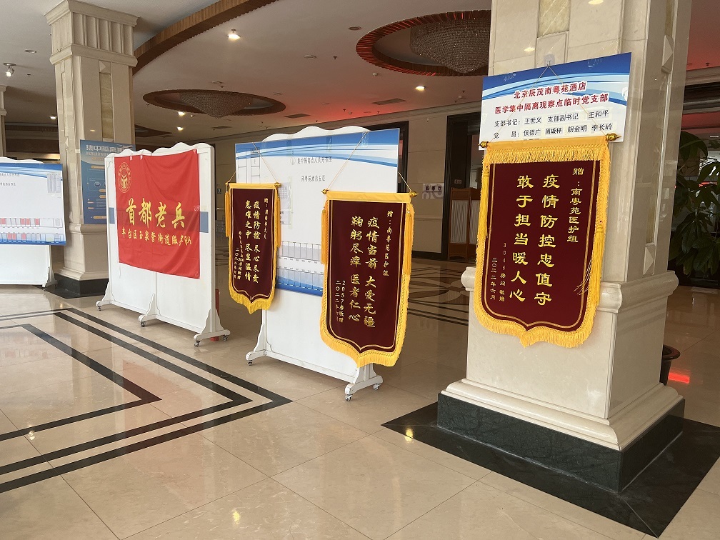 鲜红的党旗挂在大厅正中央,一面面饱含真挚感谢的锦旗分挂两旁。作为隔离点的总协调,玉泉营街道武装部部长王和平,一直与工作人员们吃住在一起,战斗在一起。“用心服务,用情服务。如今,我们圆满完成了隔离点各项任务,也得到了市区各级督察组的认可,这是大家共同努力、共同拼搏的结果,每个人都是好样的!”