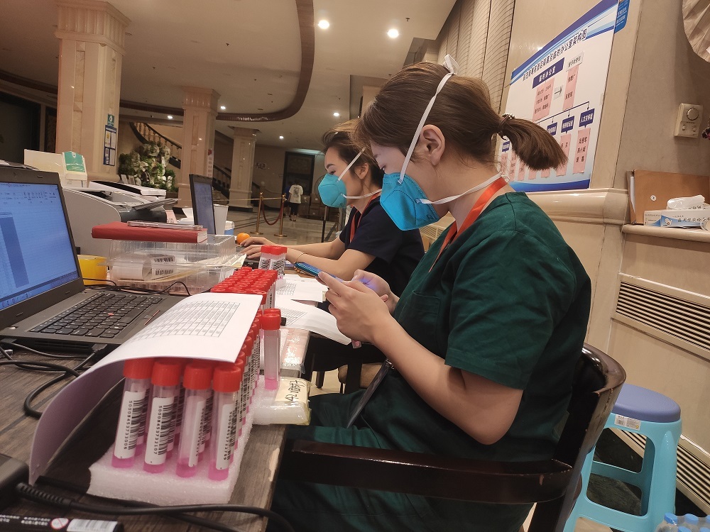 与病毒“斗智斗勇”的同时,驻守隔离点的他们也有各自放心不下的“小牵挂”,也有各自难以为人所言道的“小遗憾”。信息联络组的王静铭与病例转运组的周言是一对在5月20日刚刚登记结婚的小夫妻,同属丰台区妇幼保健院的他们因工作安排共同奔赴隔离点,由此开启一段不寻常的“蜜月”时光。虽说同在一个隔离点,但由于两个人各自有繁复的工作需要忙碌,见面的机会并不多。偶得空闲,周言会默默帮助王静铭录入信息、整理数据,制作核酸试剂管。周言忙起来顾不得吃饭,王静铭也会帮他留好餐饭,并提醒他平时注意多喝水、多休息。说起这段日子,两个人都是感慨万千。“接到命令后,我俩角色转换的很快,马上就投入到工作状态中了。”王静铭微笑着说,“但这次有他在身旁,感觉心里更踏实一些。”周言看着小静,眼神坚定语气却略带遗憾:“其实我已经策划好求婚仪式了,但突然暴发的疫情打乱了所有计划。等疫情结束,我要带小静出去好好游玩放松一下。我俩婚礼的时候,也一定喊上隔离点的兄弟姐妹们一起来。”
