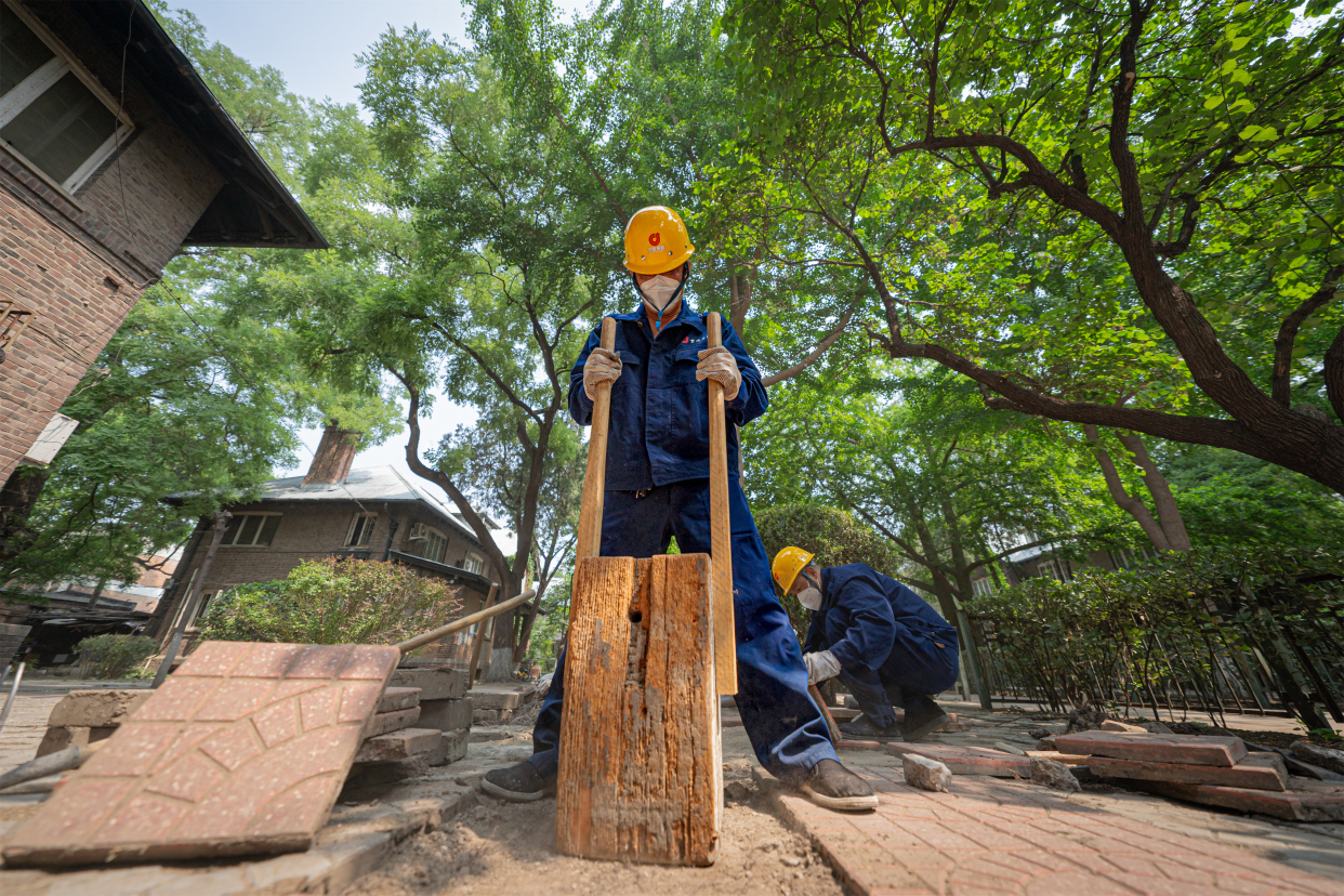 几次降雨过后,外交部街59号院内老树的树根把地面石砖拱起,造成路面坑洼不平,让居民出行犯了难。聂景波和抢险队队员们第一时间前往拆除破损路面地砖、刨出树根,再用木夯将沙土压实压平,最后重新铺上地砖,出行的道路恢复顺畅,居民纷纷点赞。