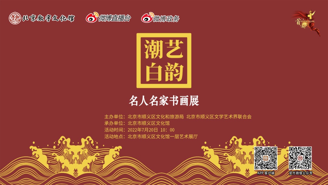 北京数字文化馆微博号→点击头像→直播【2022年顺义区文化馆艺韵潮白——名人名家书画展】观看。