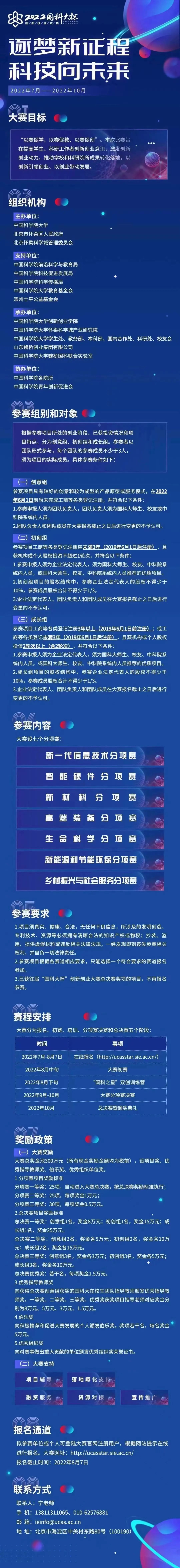 据了解,2022年“国科大杯”创新创业大赛由中国科学院大学、北京市怀柔区人民政府、北京怀柔科学城管理委员会共同主办。本届大赛将持续贯彻落实国家创新驱动发展战略,旨在建设一流社会服务体系,培养面向未来科技领军人才和创新创业人才,展示中科院各院所及国科大创新创业成果,提高学生、科研工作者创新创业意识,激发创新创业动力,推动国科大和中科院各院所成果转化落地,以创新引领创业、以创业带动发展。