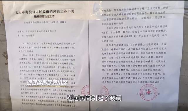 《北京市海淀区人民政府清河街道办事处限期拆除决定公告》指出,智学苑小区北一门西侧传达室、小区15号楼北侧部分围墙、小区北一门、北二门均属于违建,小区开发商应在15天内将违建自行拆除。